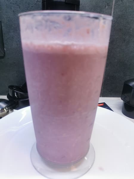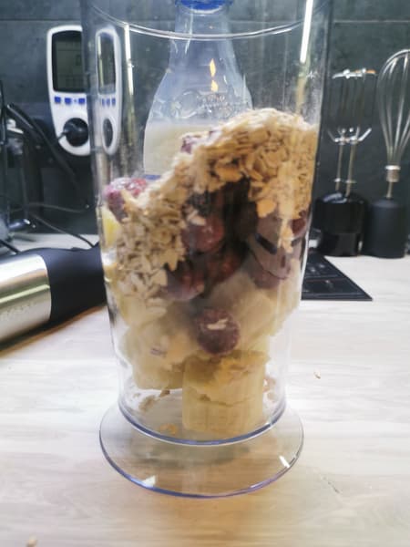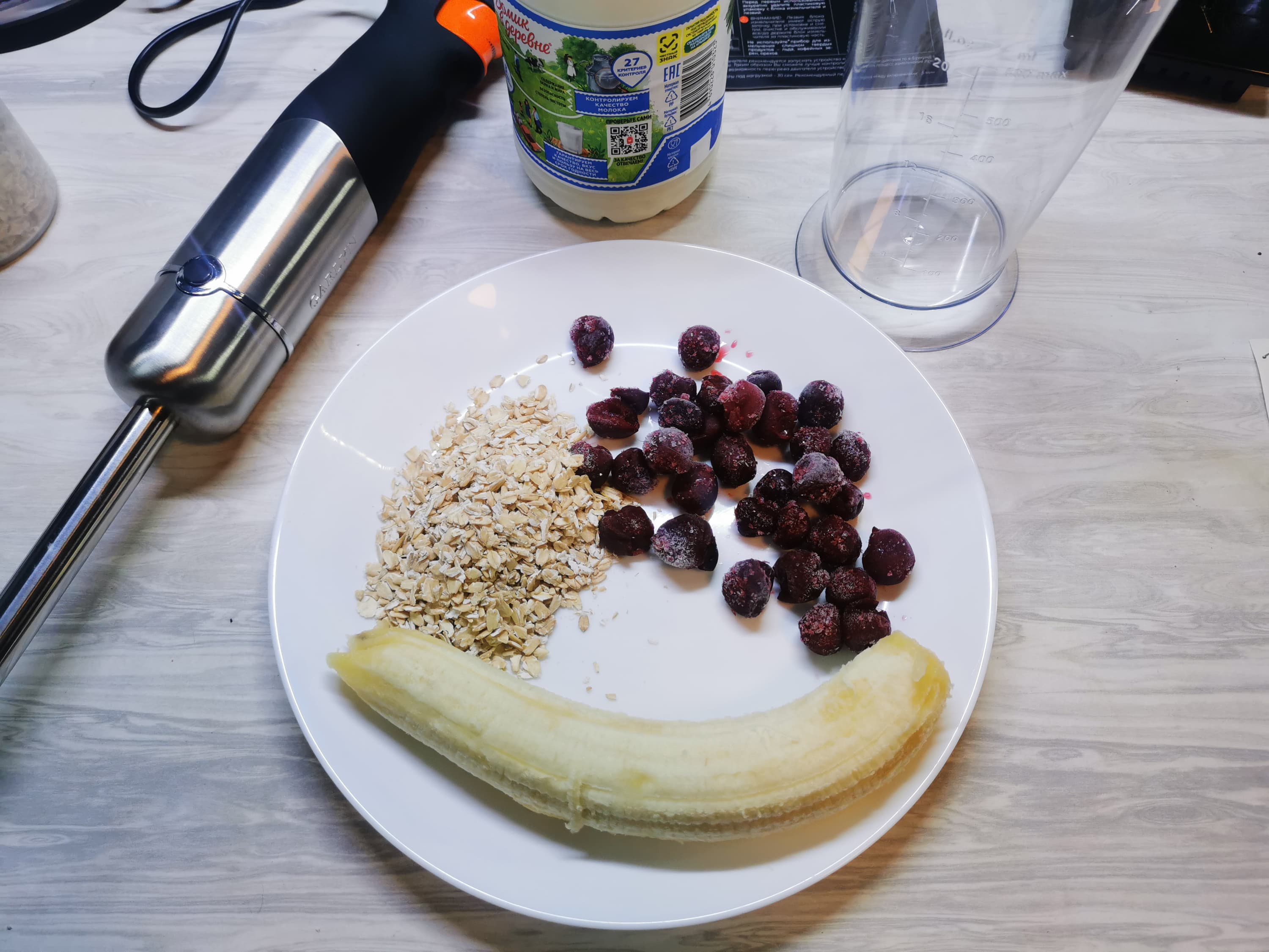 - Смузи из геркулеса, банана, замороженной вишни и молока (погружной блендер)