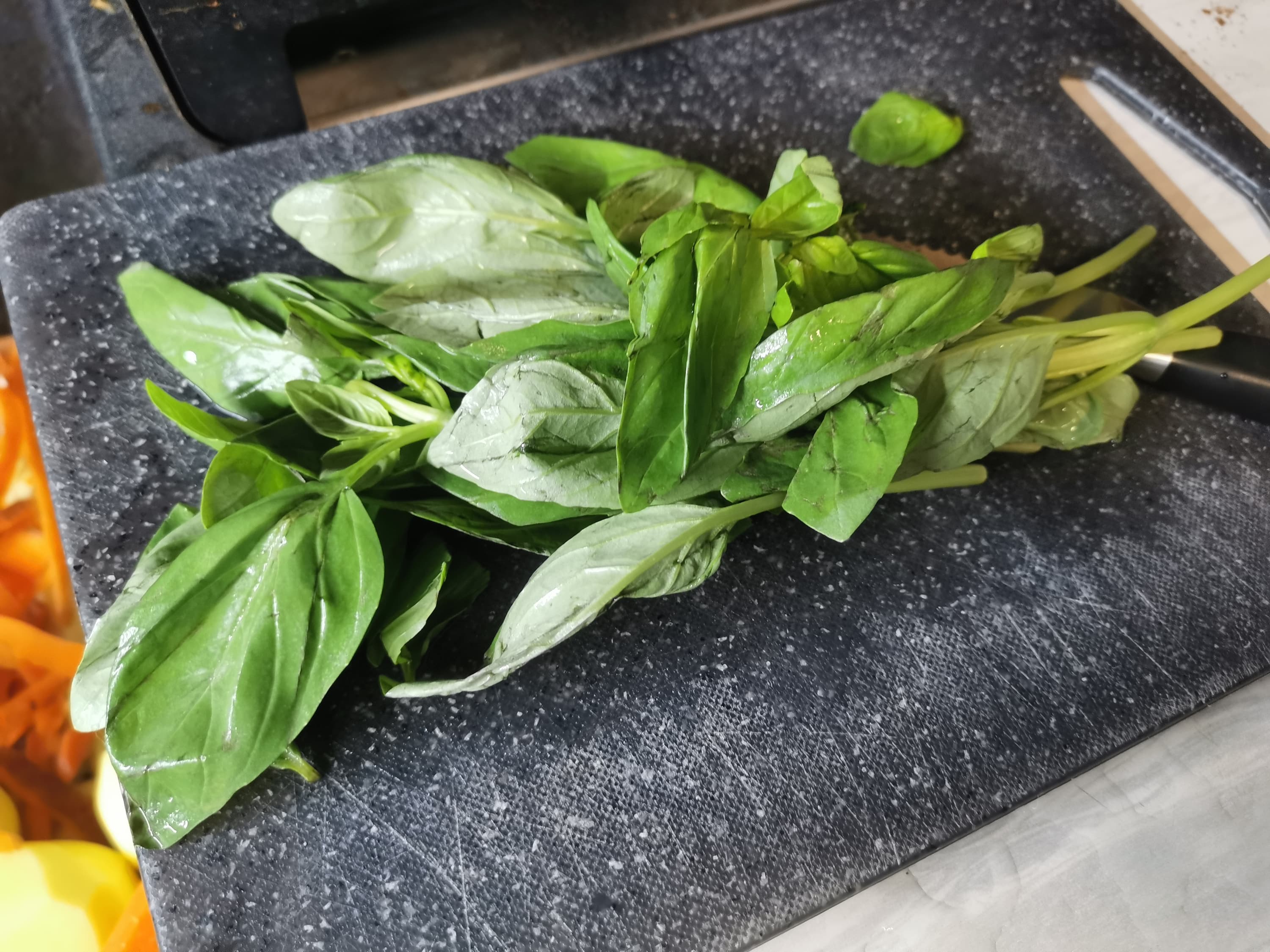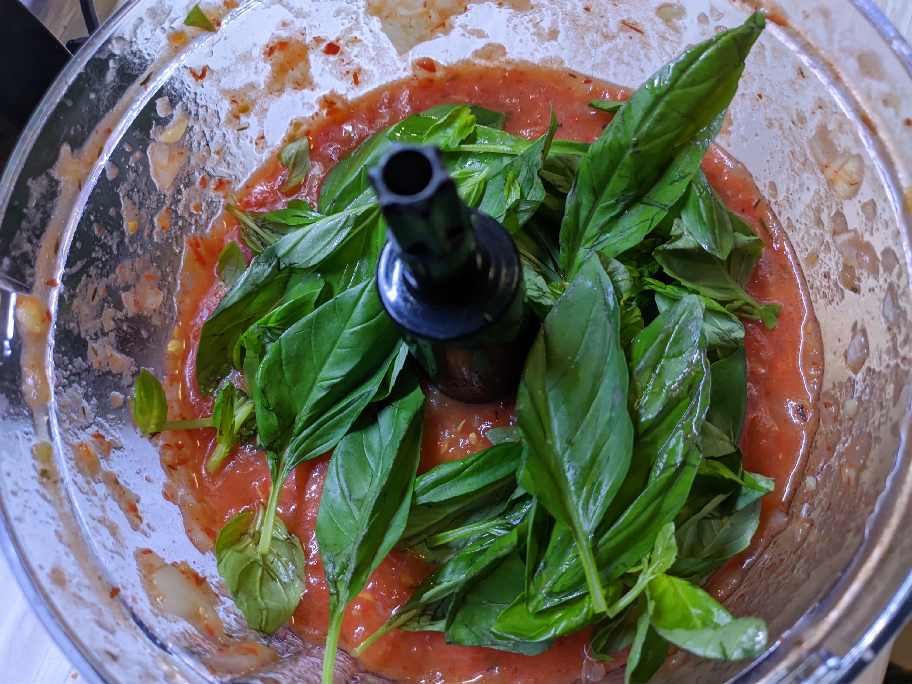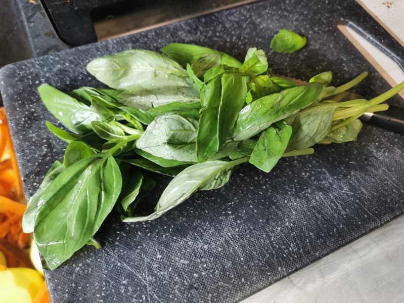 Мы помыли свежий базилик и добавили его к супу в чашу измельчителя.