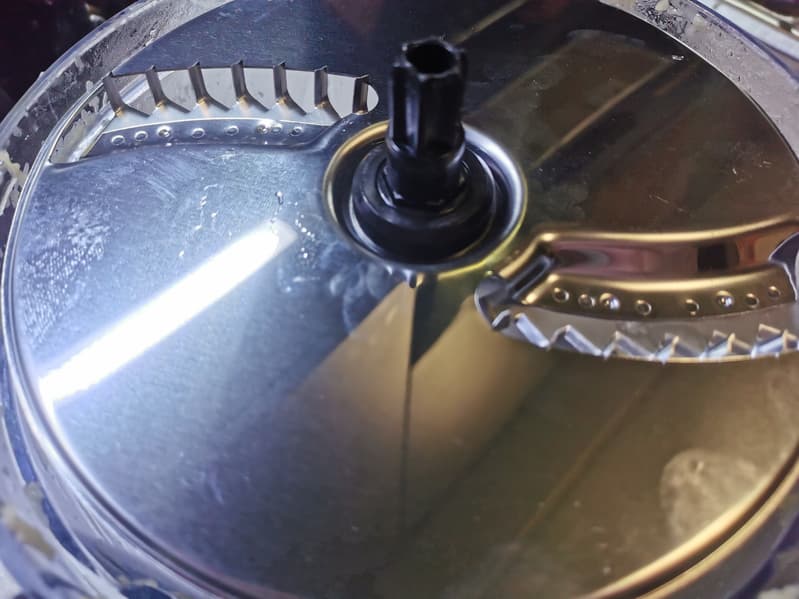 - низкая посадка дисков измельчителя в чаше, из-за чего небольшие кусочки продуктов застревают сверху на диске и не достигают лезвий