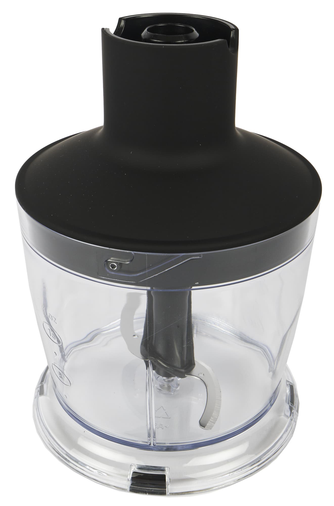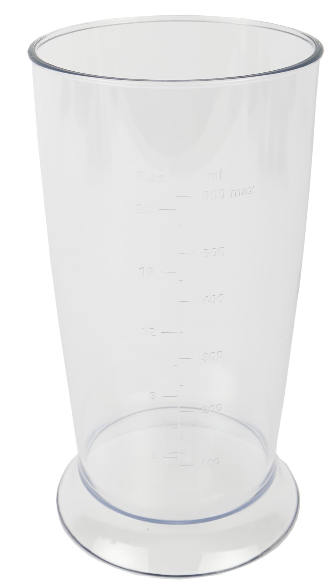 Для погружного блендера в комплекте предусмотрен стакан для измельчения из прозрачного пластика. На стенке емкости есть мерная шкала с рисками от 100 до 600 мл, с шагом в 100 мл.