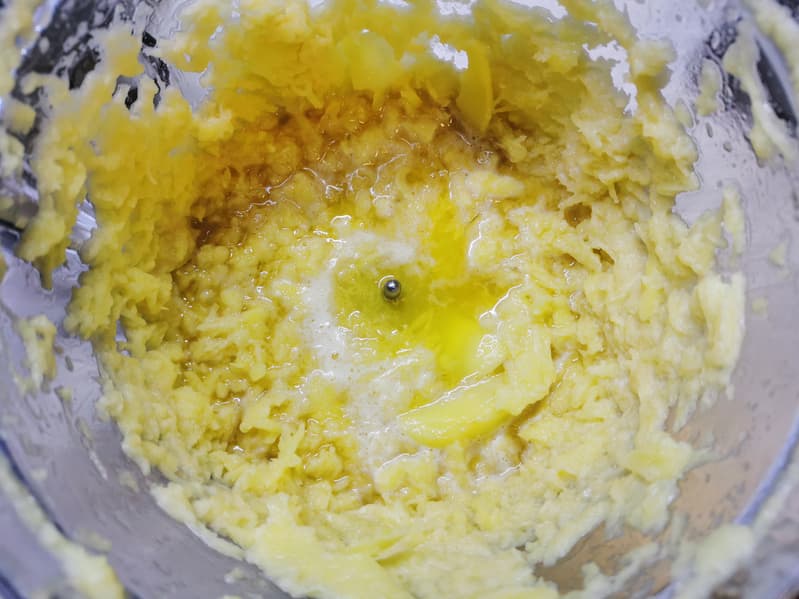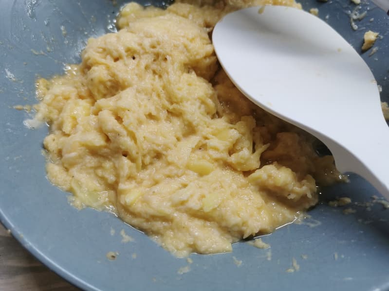 После всех процедур по отлеживанию и отжиму картошки мы смешали ее с мукой, яйцом, солью и перцем.
