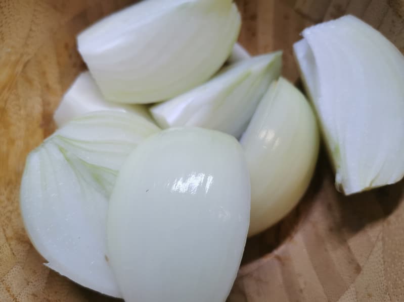 Для этого теста мы взяли очищенную морковь и лук, порезанный на четвертинки, чтобы приготовить зажарку.