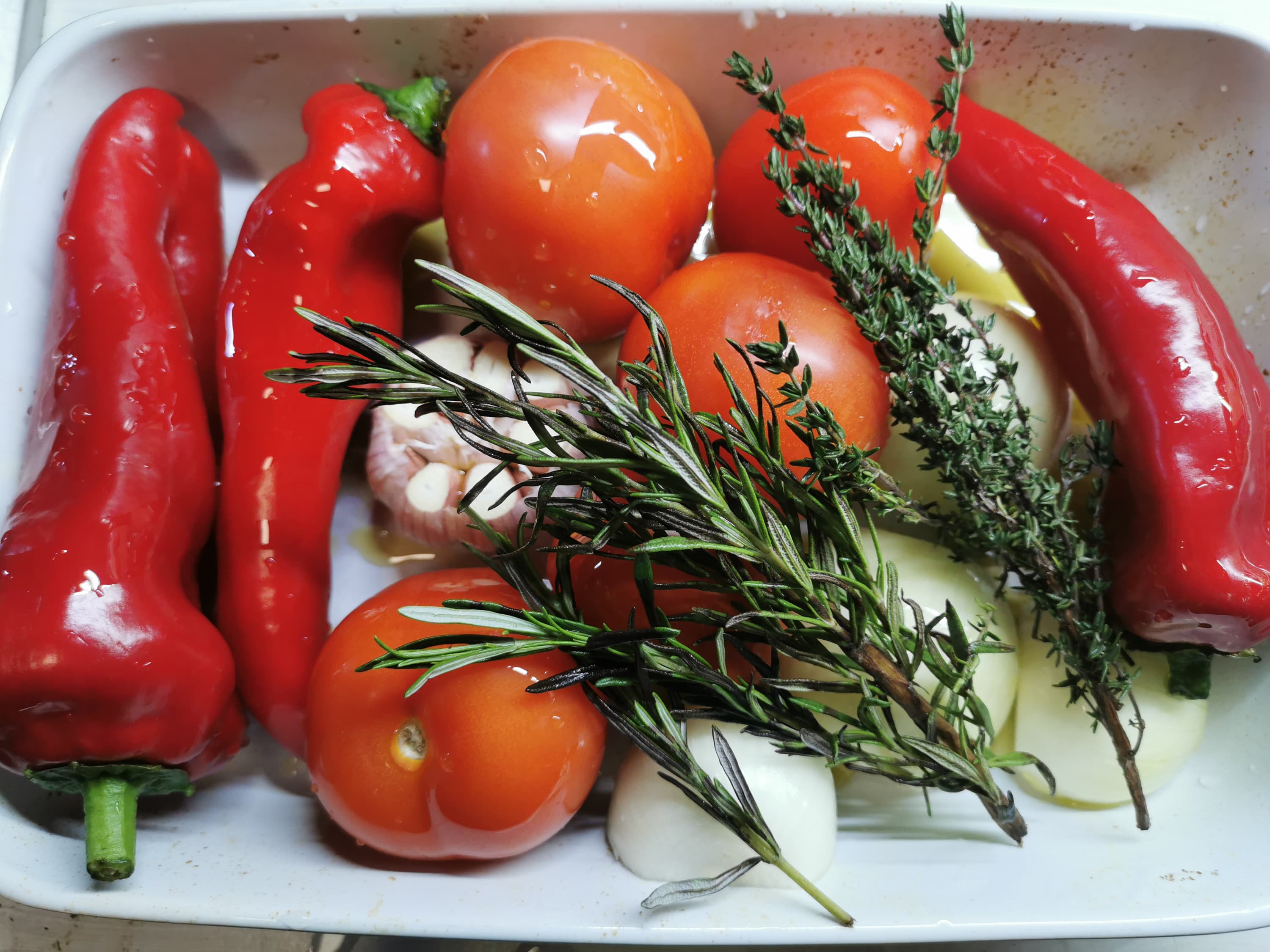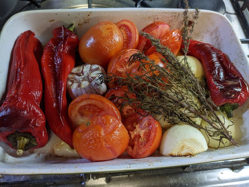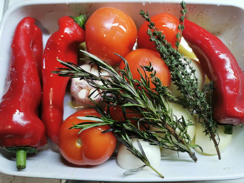 Нам понадобились сладкие перцы Рамиро, несколько томатов, 2 луковицы, головка чеснока, свежие розмарин, тимьян и базилик, оливковое масло и немного терпения.