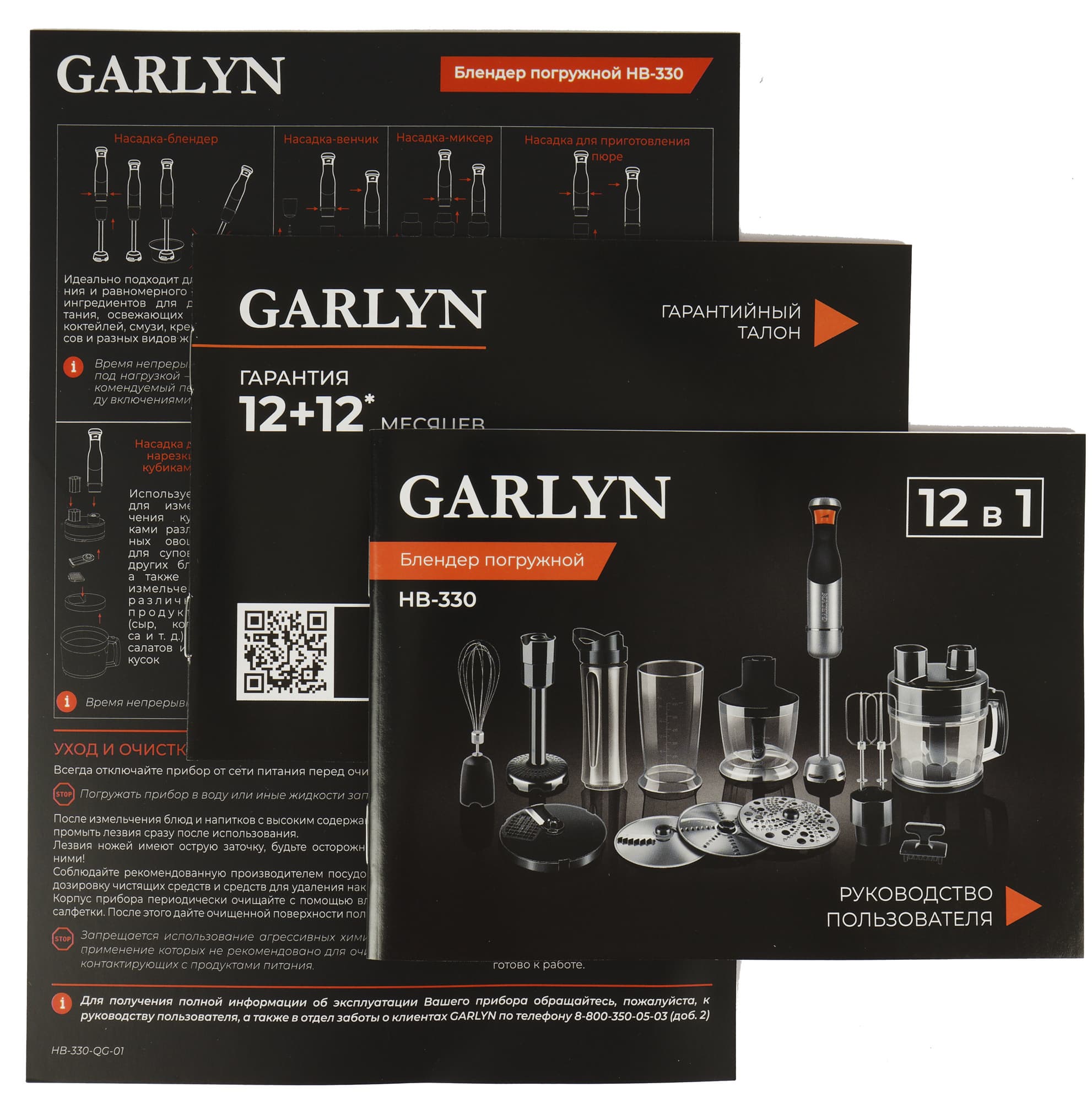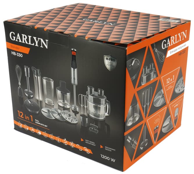 Внутренняя картонная коробка имеет глянцевое покрытие с качественной полиграфией. Она оформлена в фирменном стиле Garlyn — сверху на черном фоне размещены яркие оранжево-черные узоры, а на лицевой стороне фотографии устройства со всеми насадками, привлекающие дополнительное внимание к упаковке. Здесь также указано наименование бренда и модели, а также упоминание о том, что внутри не просто блендер, а мультисистема «12 в 1».