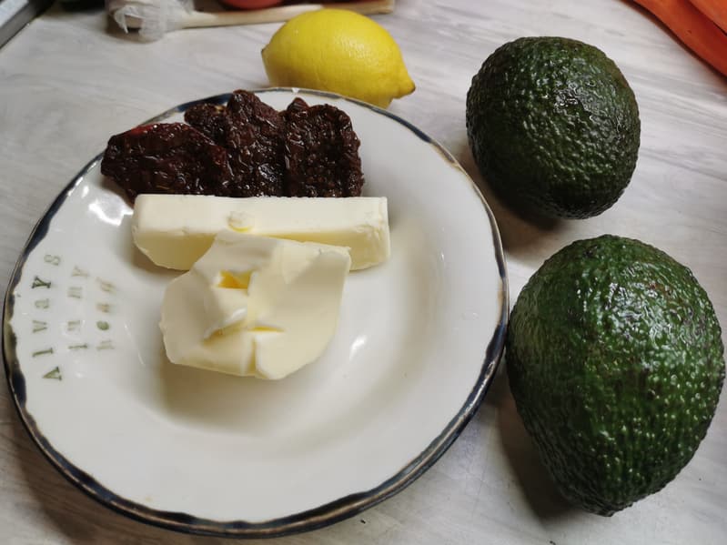 Нам понадобились 2 зрелых авокадо, 100 г масла (получилось немного больше), несколько вяленых томатов, лимон, соль и молотый черный перец.