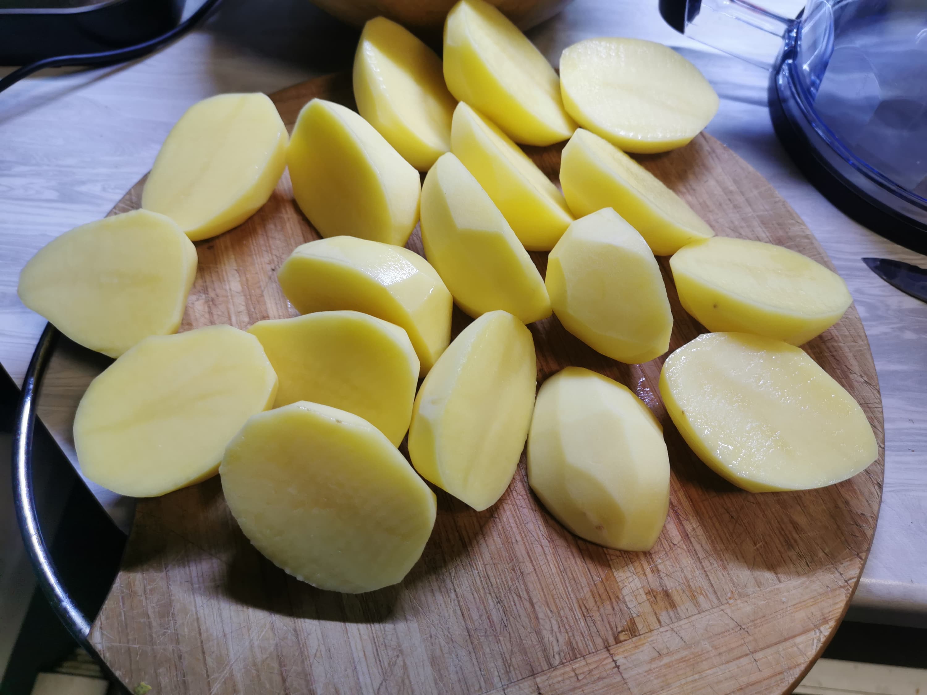 Для приготовления драников и также для следующего теста с картофелем-фри мы очистили и нарезали картофель на половинки, чтобы они легко помещались в загрузочное отверстие, ведь нам предстояло воспользоваться большой чашей с различными дисками.