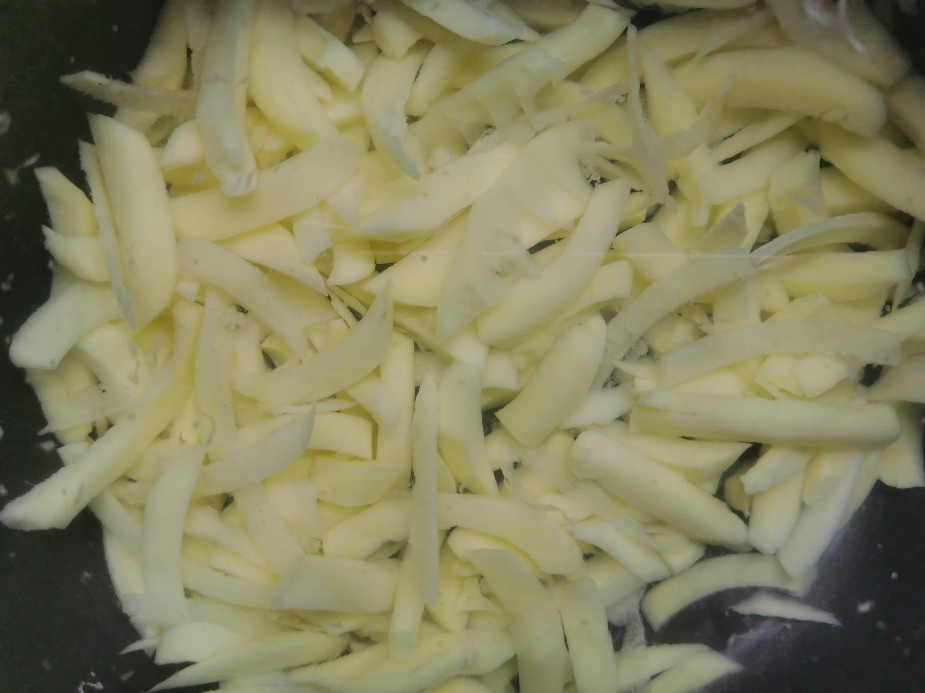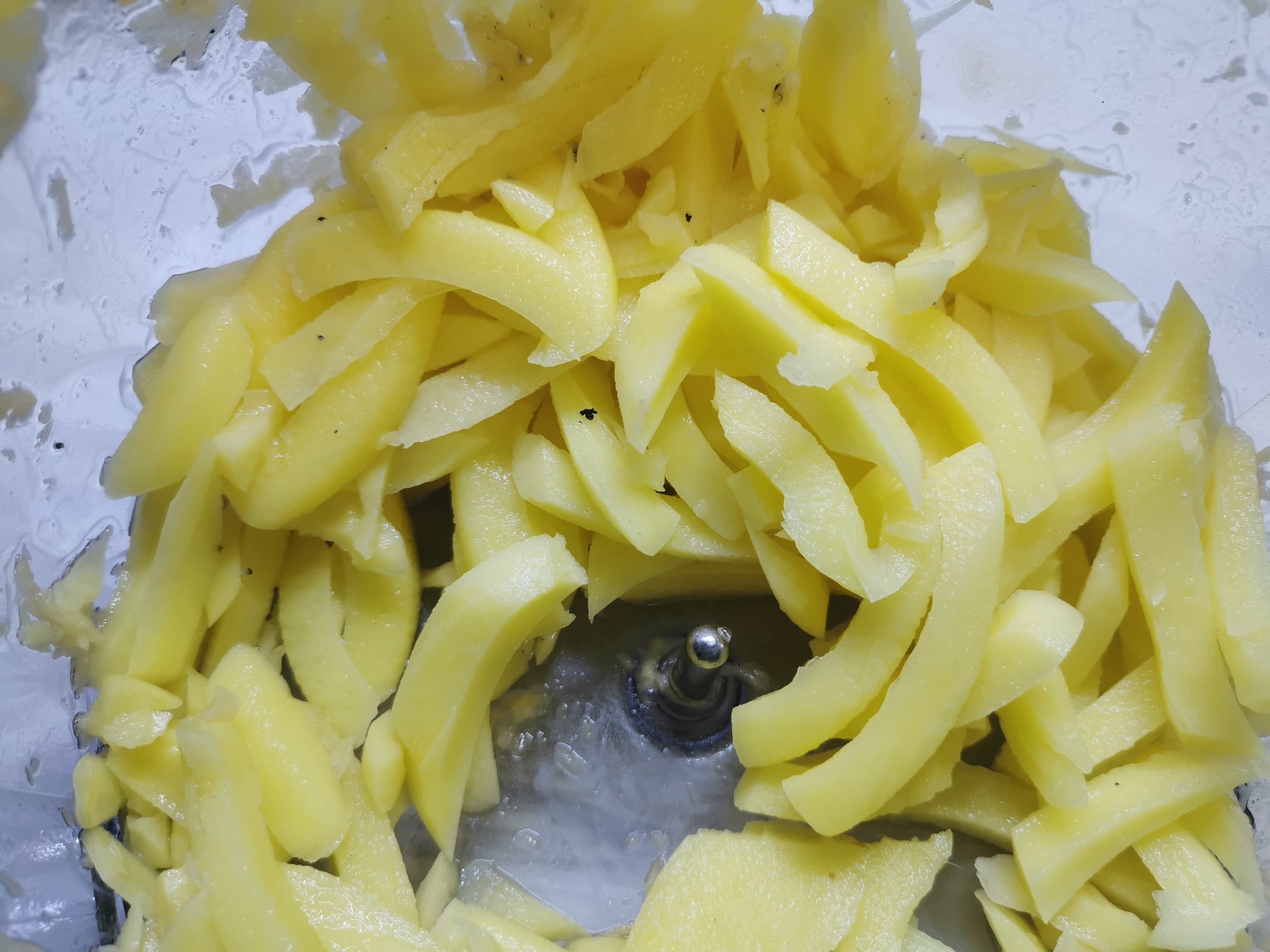 Некоторые кусочки получились более тонким, так как картофель периодически застревал между диском и крышкой чаши и натирался до плоских кусочков, которые мы изымали и загружали в отверстие по новой.