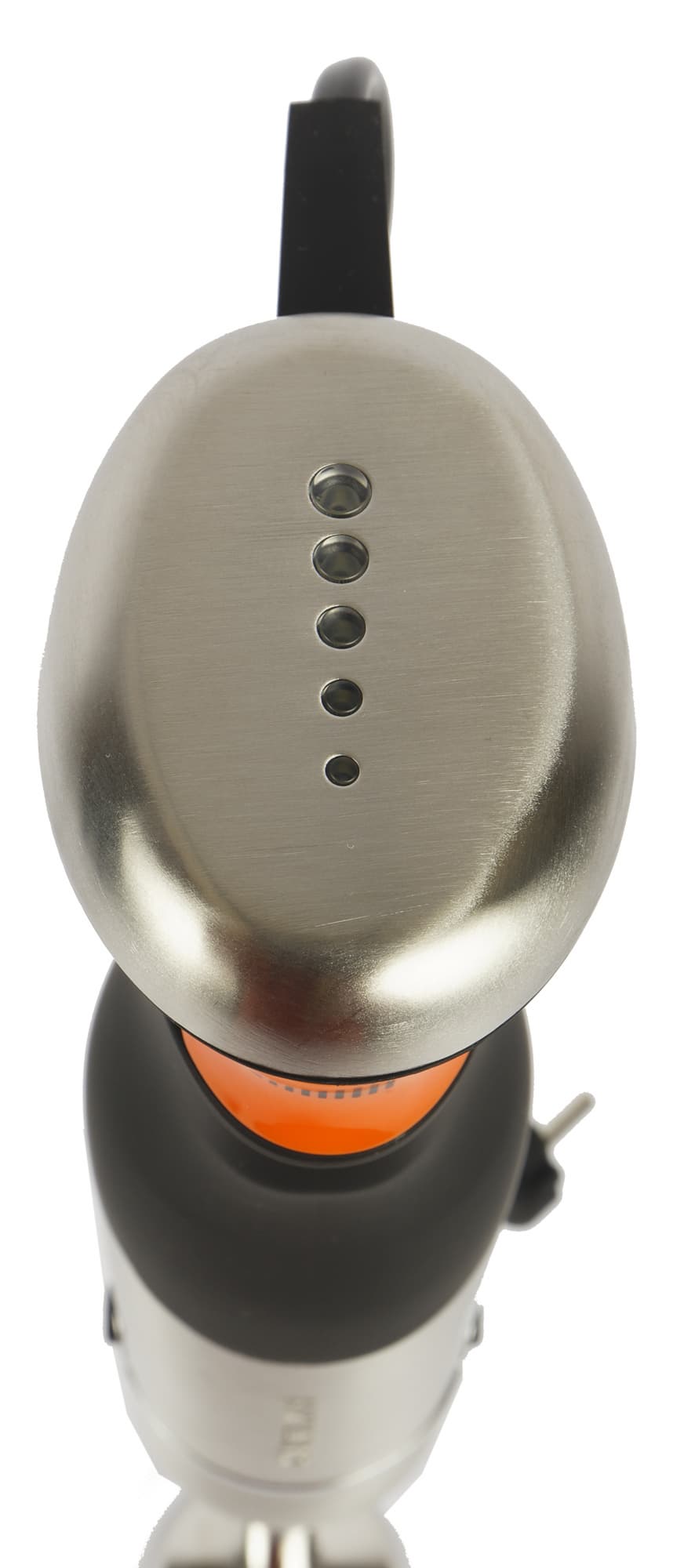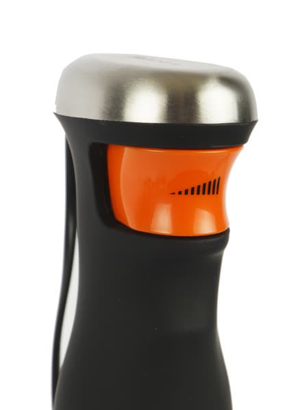 На верхушке моторного блока мы видим пять круглых отверстий разного размера с индикаторами режимов работы. Что примечательно, оранжевая кнопка удобнее всего нажимается указательным, а не большим пальцем, как это бывает обычно у погружных блендеров. Но при желании можно менять способ нажатия. Нажимая на нее, мы ощущаем небольшое перещелкивание при углублении кнопки — именно это обеспечивает у HB-330 плавное переключение скоростей.