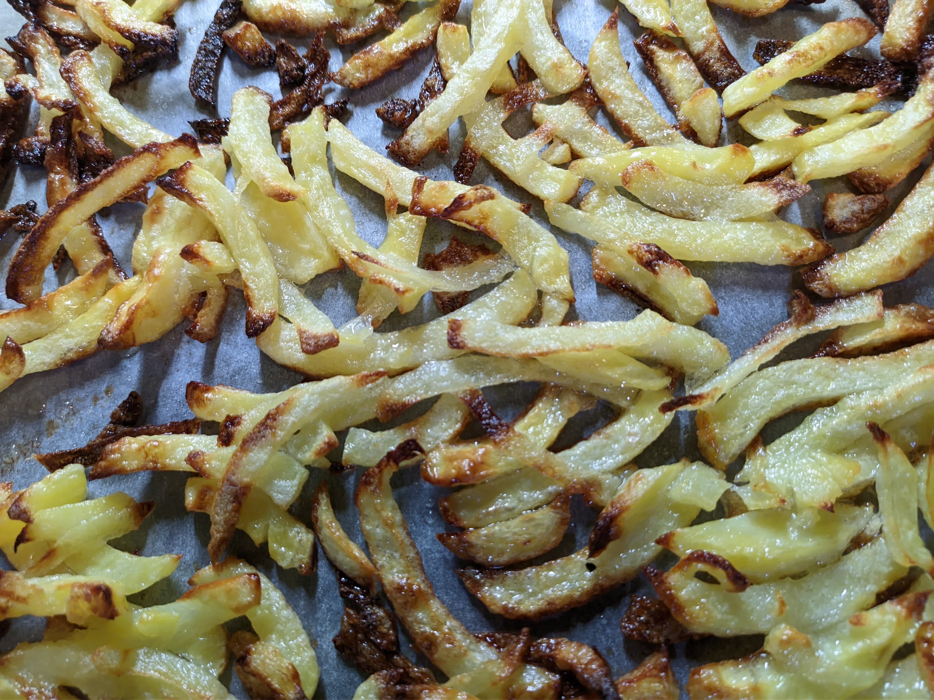После срабатывания таймера мы вытащили противень и поняли, что слегка переборщили либо со временем приготовления, либо с выставленной температурой. Картофель в середине получился хорошим, а вот по бокам подгорел. Мы посолили лучшую его часть, и на вкус она оказалась неплохой.