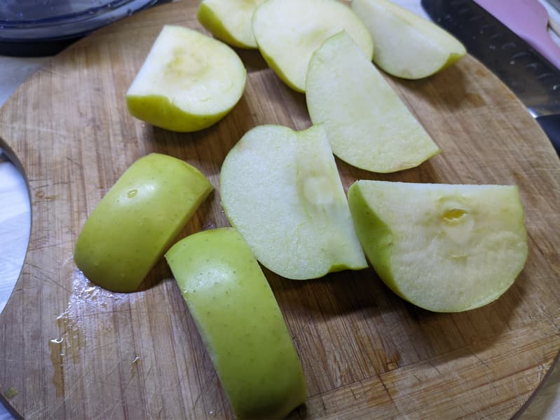Огурцы мы оставили целыми, а яблоки порезали на несколько крупных кусков, чтобы они пролезали в загрузочное отверстие.