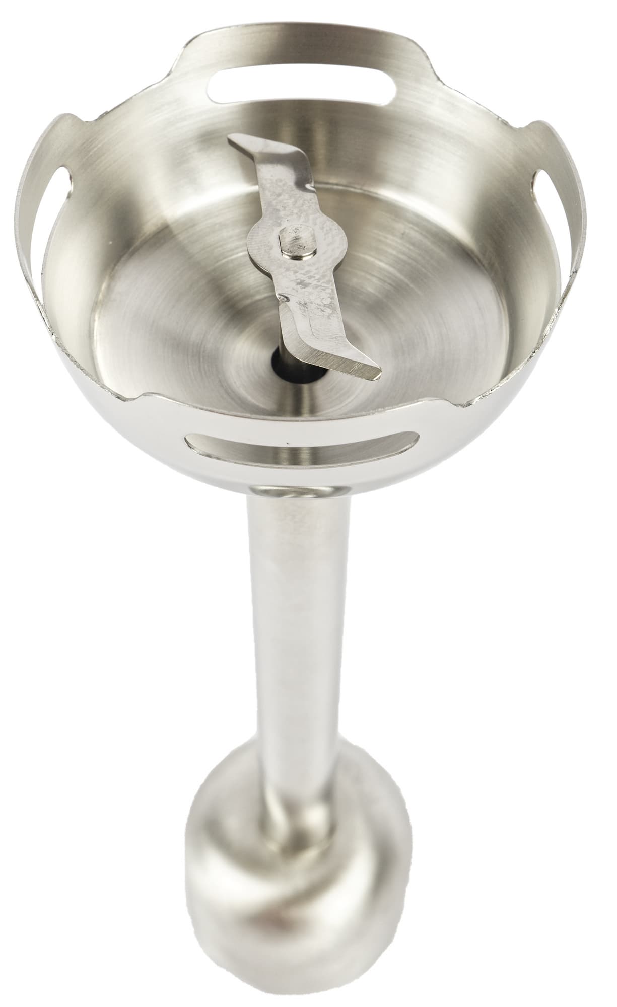 Насадка-блендер сделана из нержавеющей стали. Внизу расположен круглый купол с неровным краем и четырьмя отверстиями для лучшего смешивания ингредиентов и нейтрализации брызг. Внутри купола находится нож с двумя лопастями. У каждой лопасти один край имеет остро заточенное лезвие, а второй тупой. Также концы лепестков ножа загнуты: один — вверх, другой — вниз.