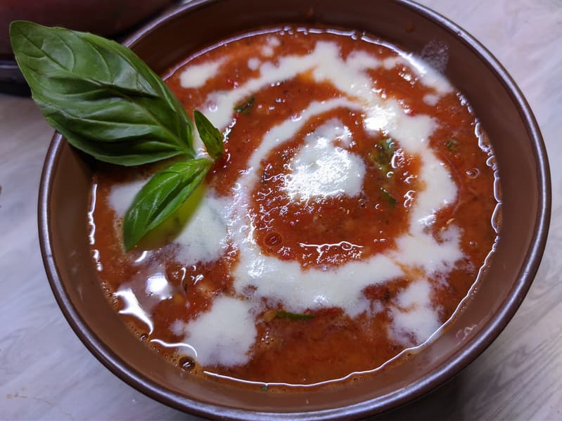 При подаче добавили в суп немного сливок. Блюдо получилось невероятно ароматным, вкусным, с многогранным послевкусием перцев, трав и запеченного чеснока.