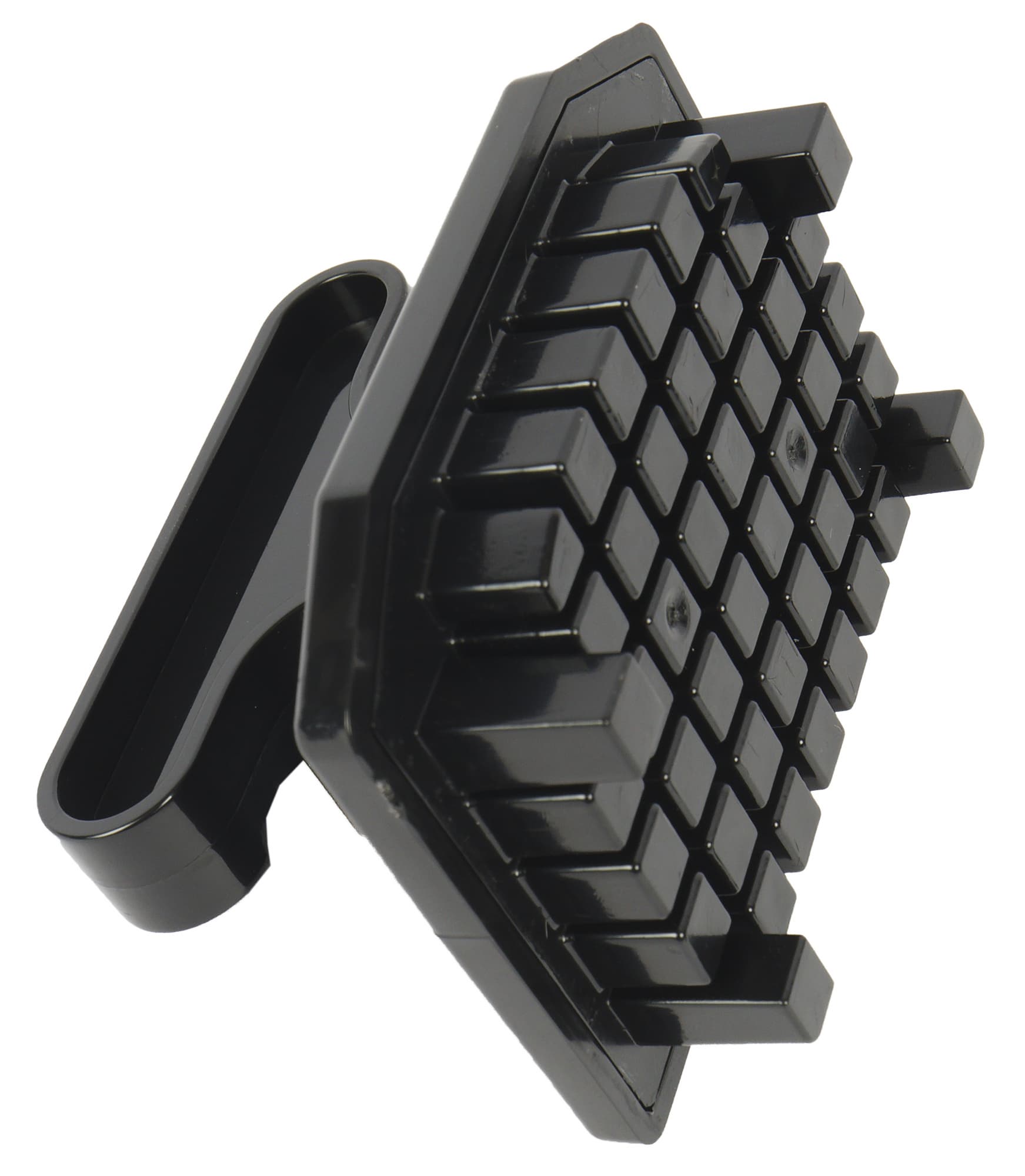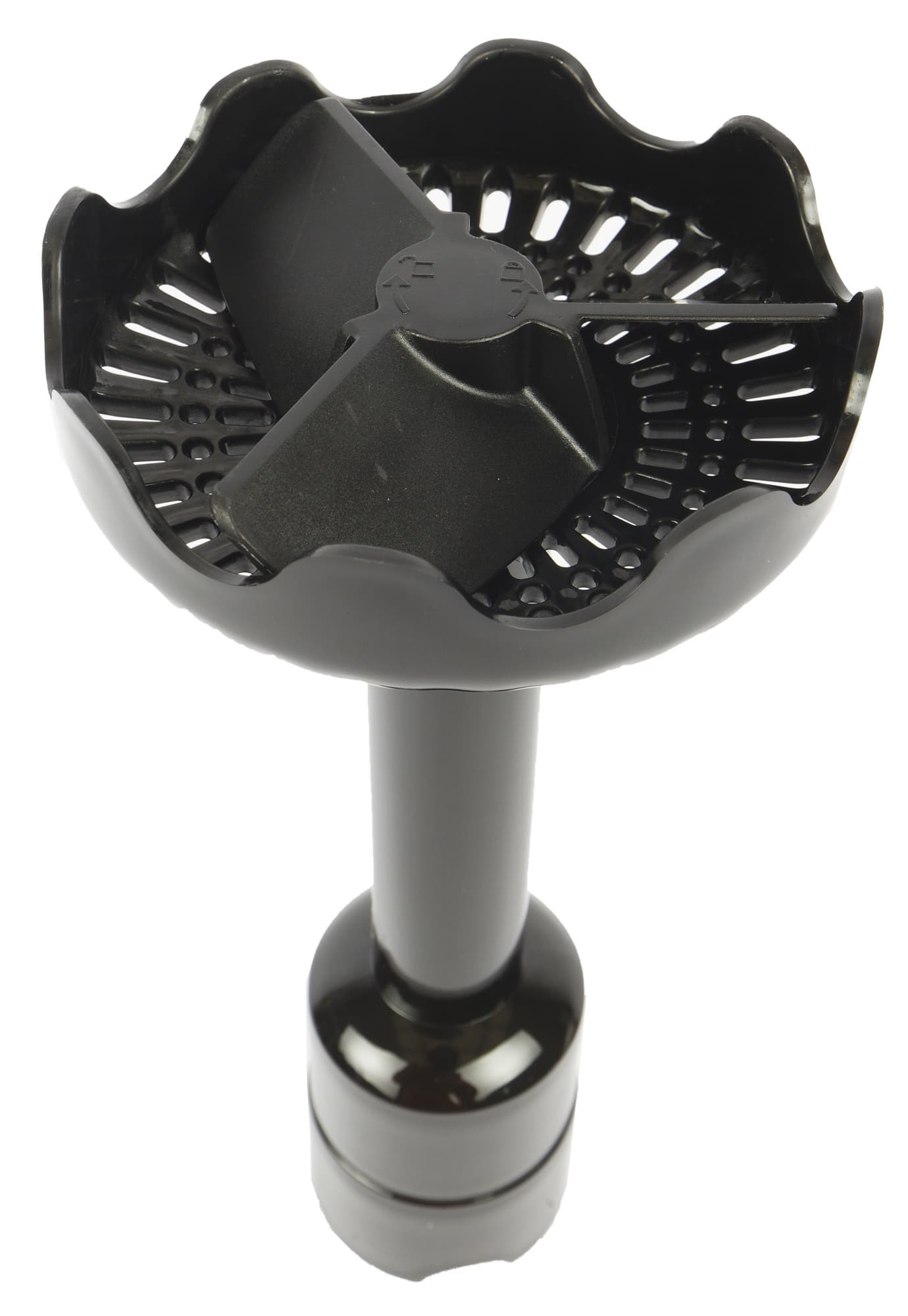 Насадка для приготовления пюре сделана из черного термостойкого пластика. У нее широкий сквозной купол с волнистым краем, чтобы с легкостью пропускать пюре и воздух из центра наружу. Внутри купола находятся три пластиковые лопасти, которые вращаются во время работы, перемешивая и измельчая отварной картофель (или другие овощи).