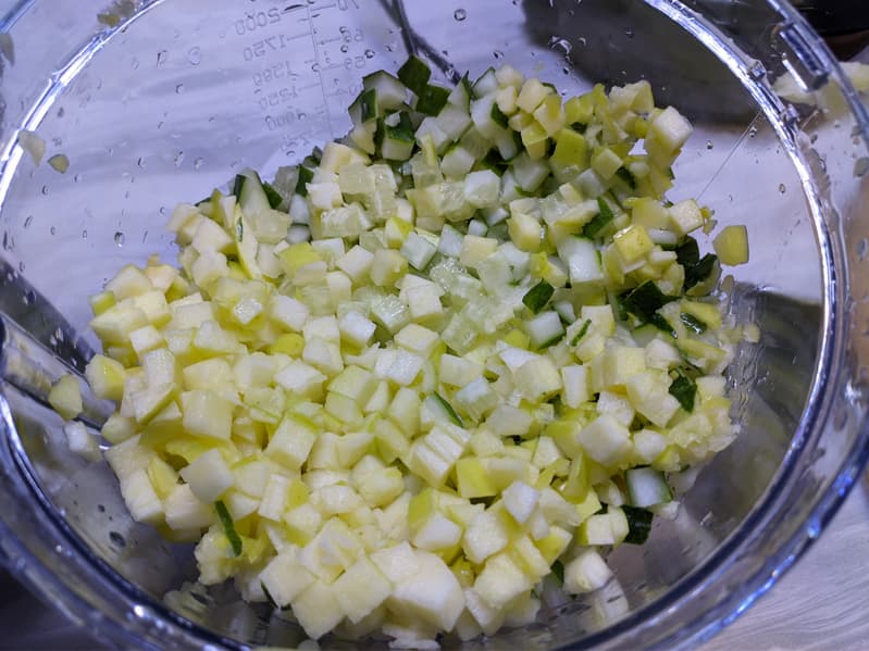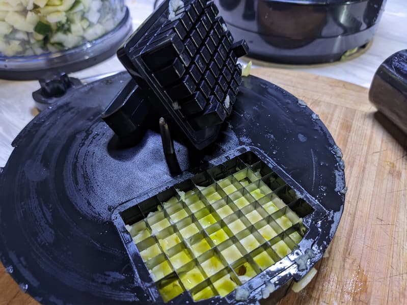 Мы установили диск с решеткой для нарезки кубиками и крутящийся нож, крышку чаши и приступили к работе на максимальной мощности.