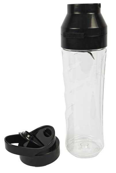 Также в комплекте к прибору идет интересная насадка-бутылка объемом 600 мл, которую нечасто встретишь у блендеров. Она представляет собой пластиковую бутылку из прозрачного противоударного пластика, с фиксирующимся на ней ножом на черном пластиковым основании, способным измельчить мелко порезанные овощи и фрукты для смузи или соуса. После измельчения основание с ножом можно снять и заменить его на крышку, чтобы бутылку можно было взять с собой в спортзал, на прогулку или в дорогу.
