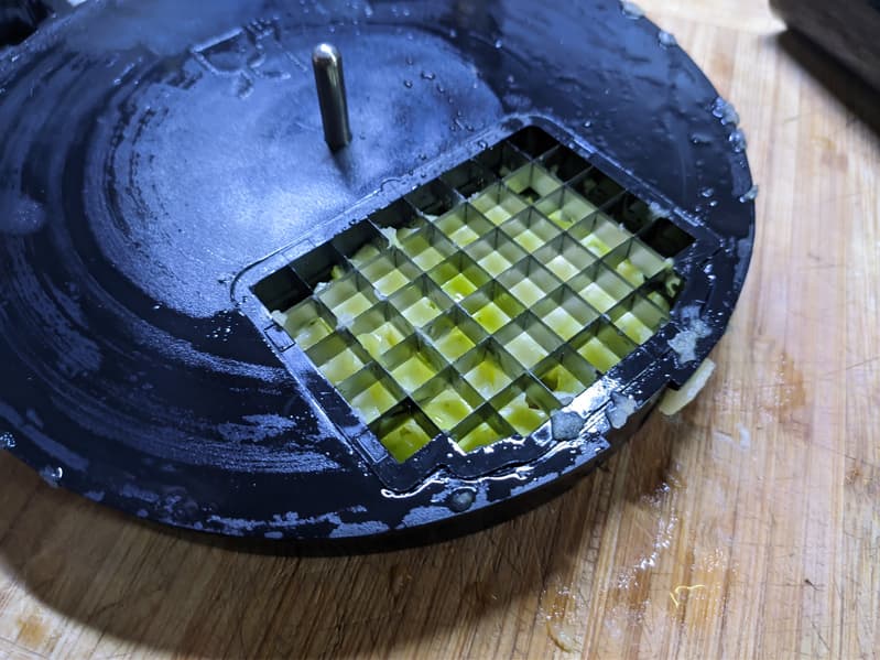 Яблоко пару раз повторяло историю овощей, стирающихся до тонкого диска и застревающих между диском и лезвием. А вот огурец прошел путь от плода до кубиков без каких либо сложностей.