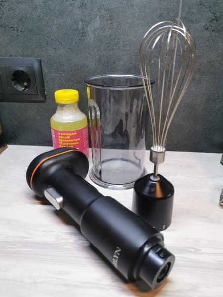Моторный блок увесистый сам по себе, а с аккумулятором и насадкой-блендером становится еще тяжелее (922 г). Но он действительно удобно и надежно лежит в руке, поэтому от него особо не устаешь, тем более что бо́льшую часть своих задач он выполняет не дольше 2 минут.