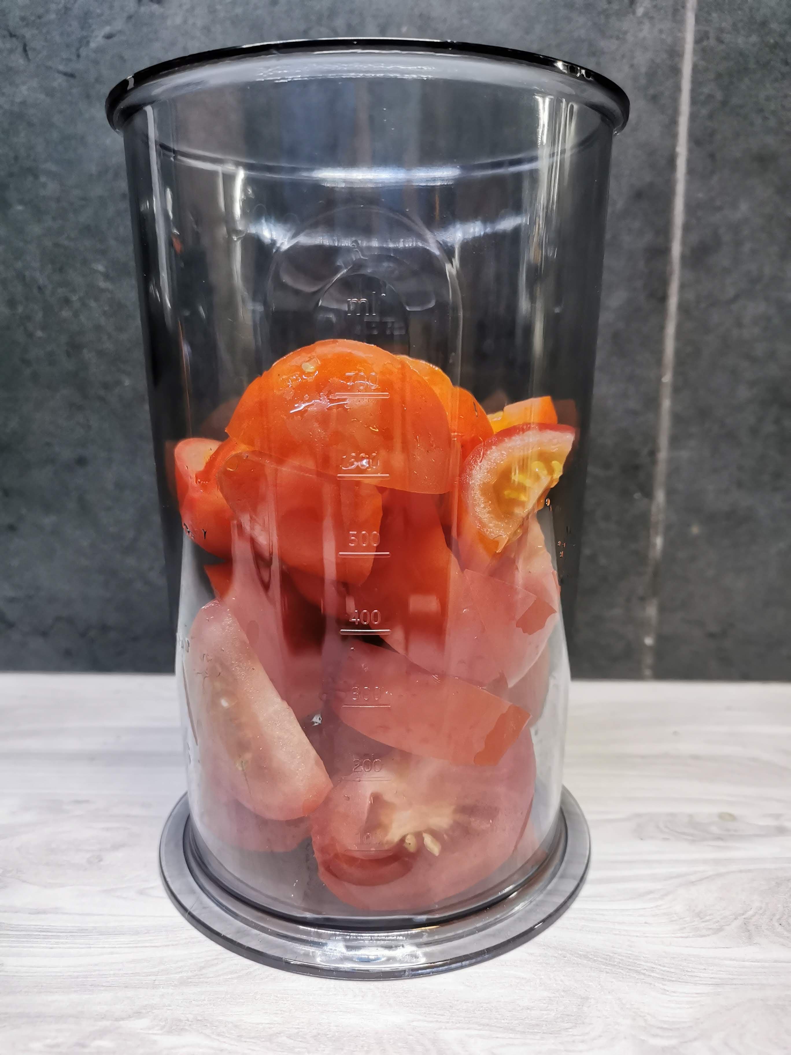 Для обязательного томатного теста мы сложили в комплектный стакан четвертинки плодов, заполнив емкость до максимальной отметки.