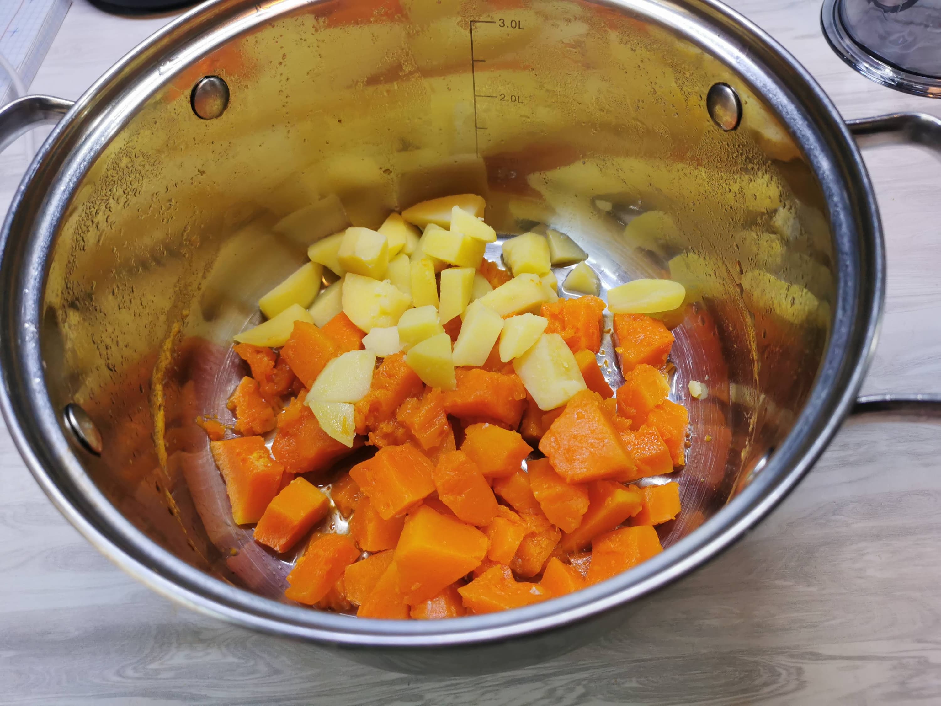 Для начала мы почистили, нарезали небольшими кусочками и отварили картофель и тыкву.