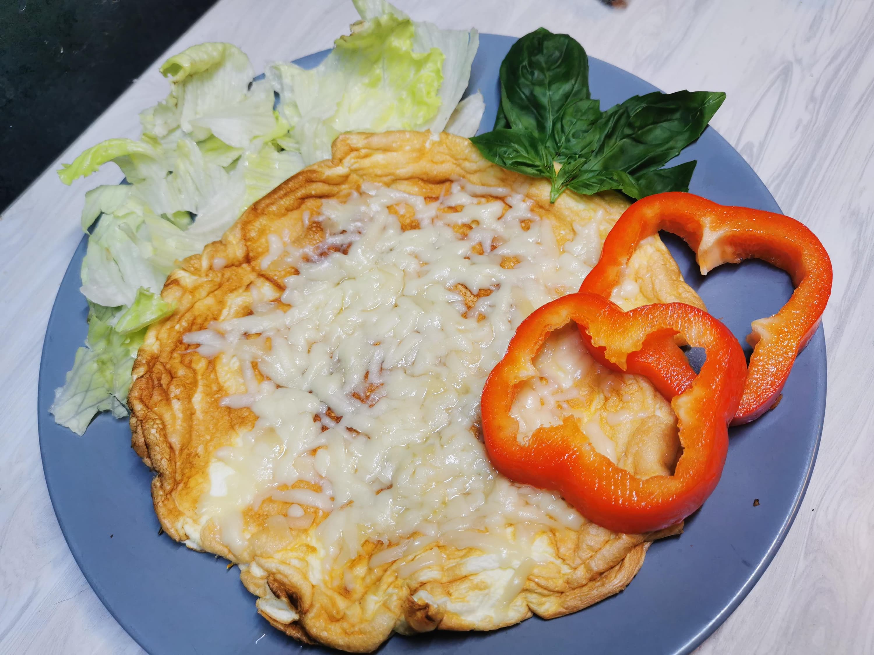 Мы добавили к омлету тертый пармезан и немного свежих овощей. Думаем, спортсменам бы понравился такой завтрак.
