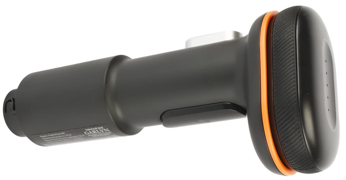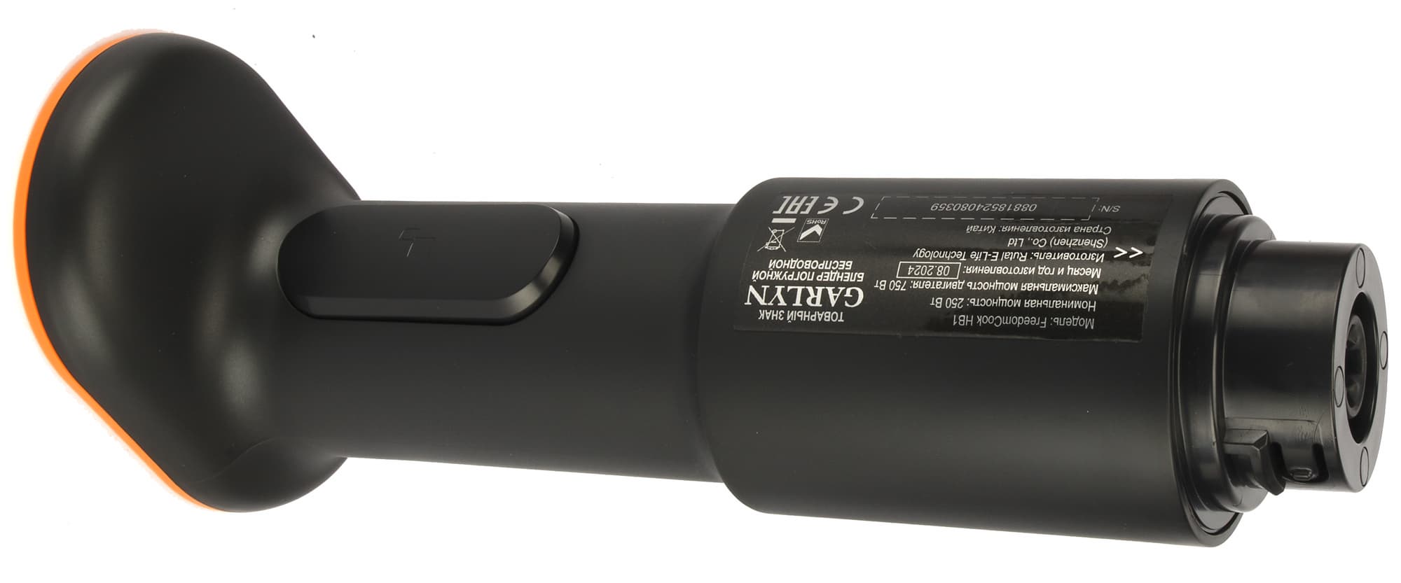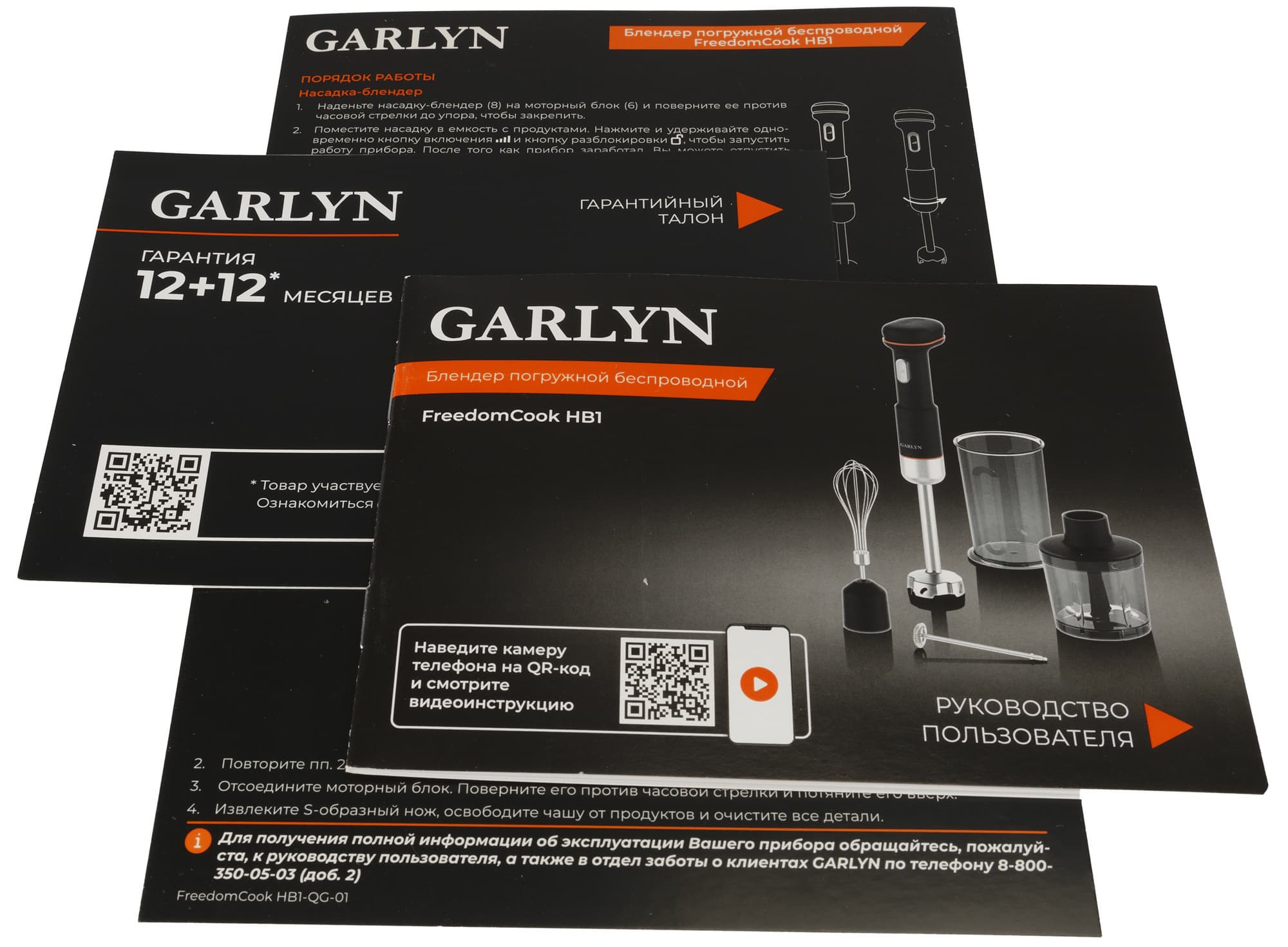 Внутренняя картонная коробка имеет глянцевое покрытие с качественной полиграфией. Она оформлена в фирменном стиле Garlyn — сверху на черном фоне размещены яркие оранжево-черные узоры, а на лицевой стороне фотографии устройства со всеми насадками, привлекающие дополнительное внимание к упаковке. Здесь указано наименование бренда и модели, добавлена информация о совместимости блендера со специальным съемным аккумулятором и наименование его модели, а также выделены некоторые технические особенности прибора.