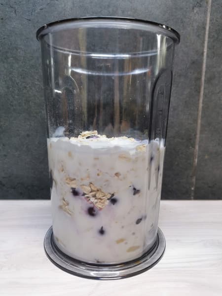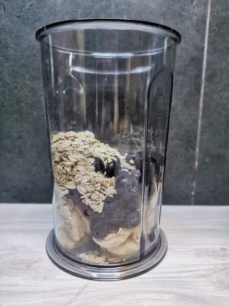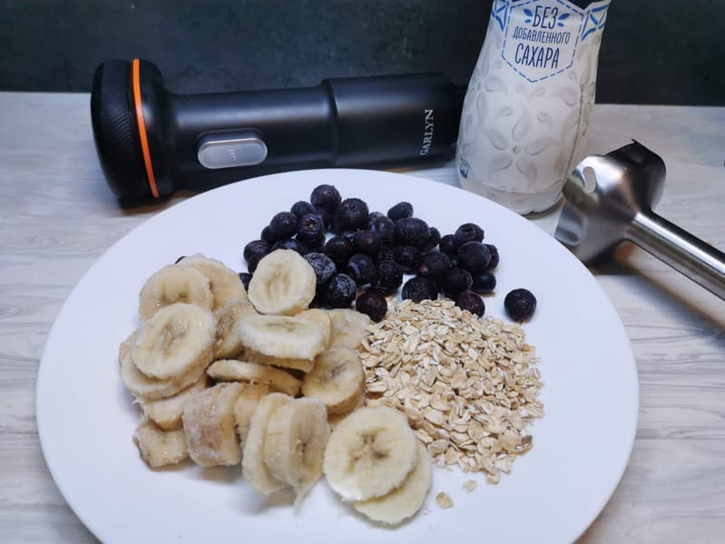 Одним из наших классических тестов для проверки возможностей блендера является тест с разными по текстуре продуктами. В этот раз мы взяли геркулес, замороженные кусочки банана и ягоды голубики и добавили к ним немного питьевого йогурта.