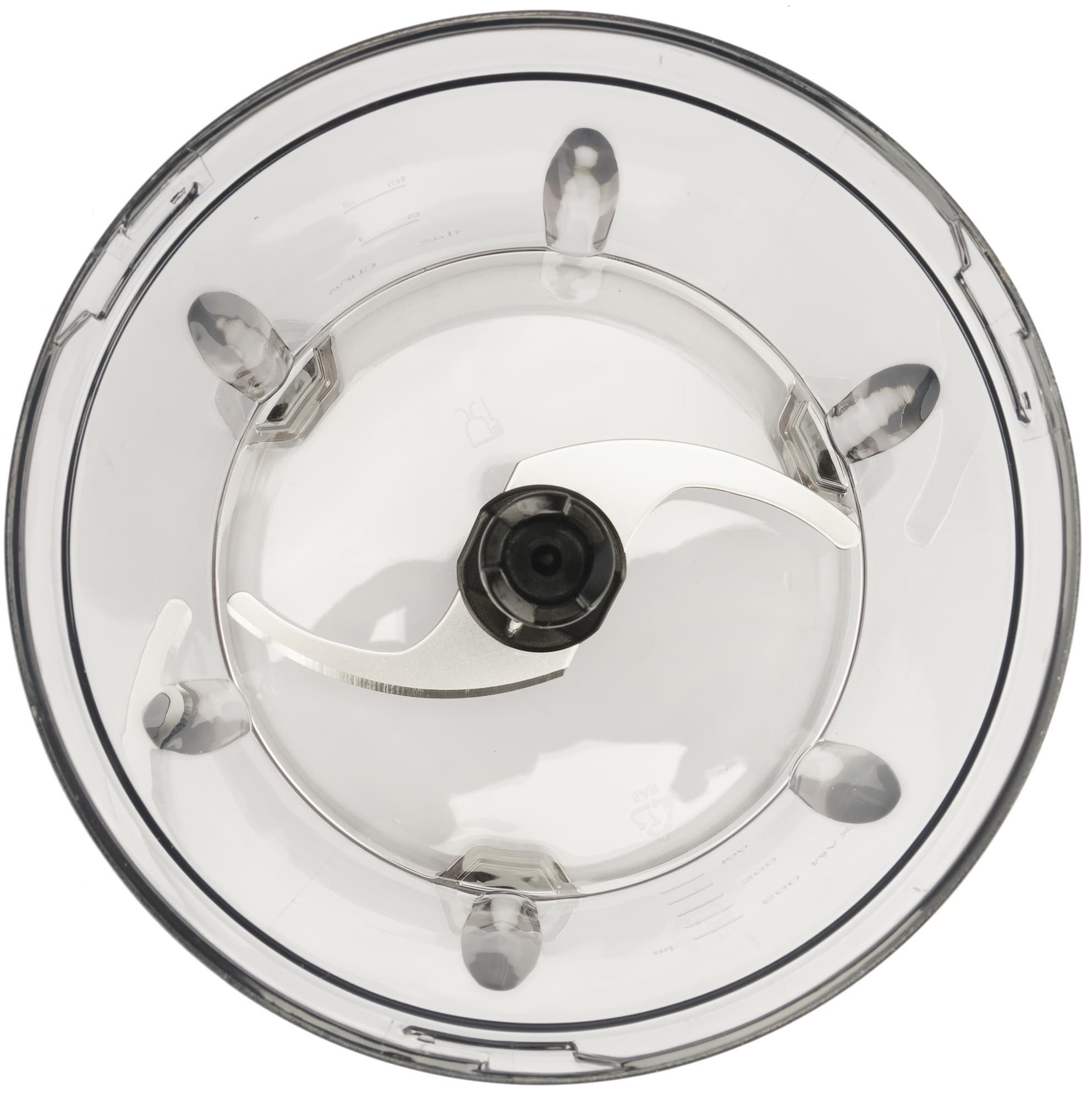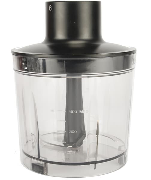Чаша измельчителя также выглядит привычно: чуть суженная книзу пластиковая емкость с рабочим объемом 500 мл со штырем для установки s-образного ножа и крышка с возвышением для присоединения моторного блока. На гранях чаши также имеются риски в миллилитрах и унциях.