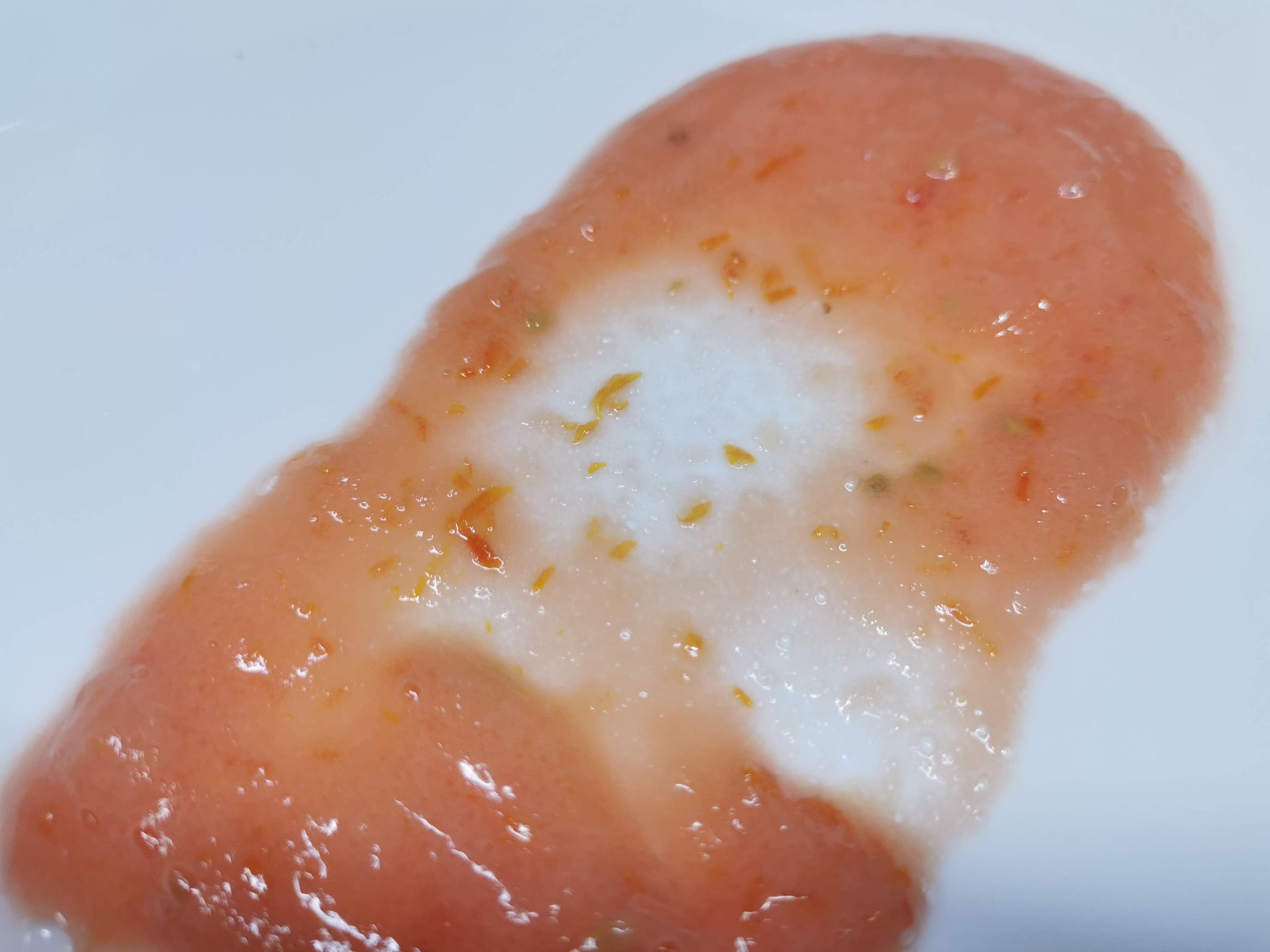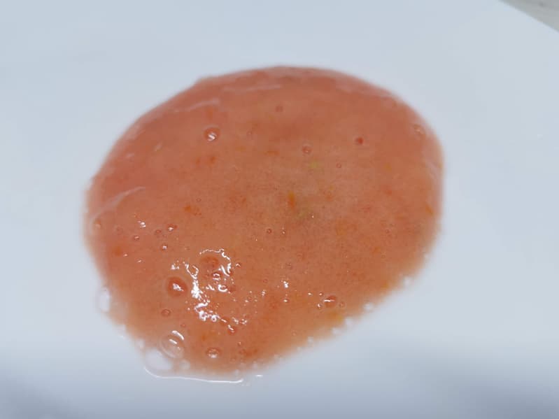 На первый взгляд томатная смесь выглядит однородной, но при более детальном рассмотрении можно обнаружить множество неперемолотых частичек шкурки и семян.
