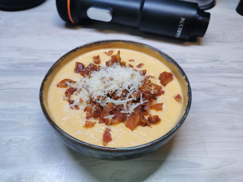 Для большего удовольствия мы добавили к супу тертый пармезан и хрустящие кусочки бекона.