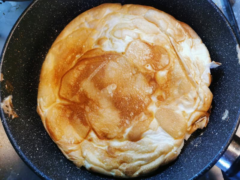Переворачивать такой воздушный омлет одно удовольствие — он ощущается невесомым и очень хорошо держит форму.