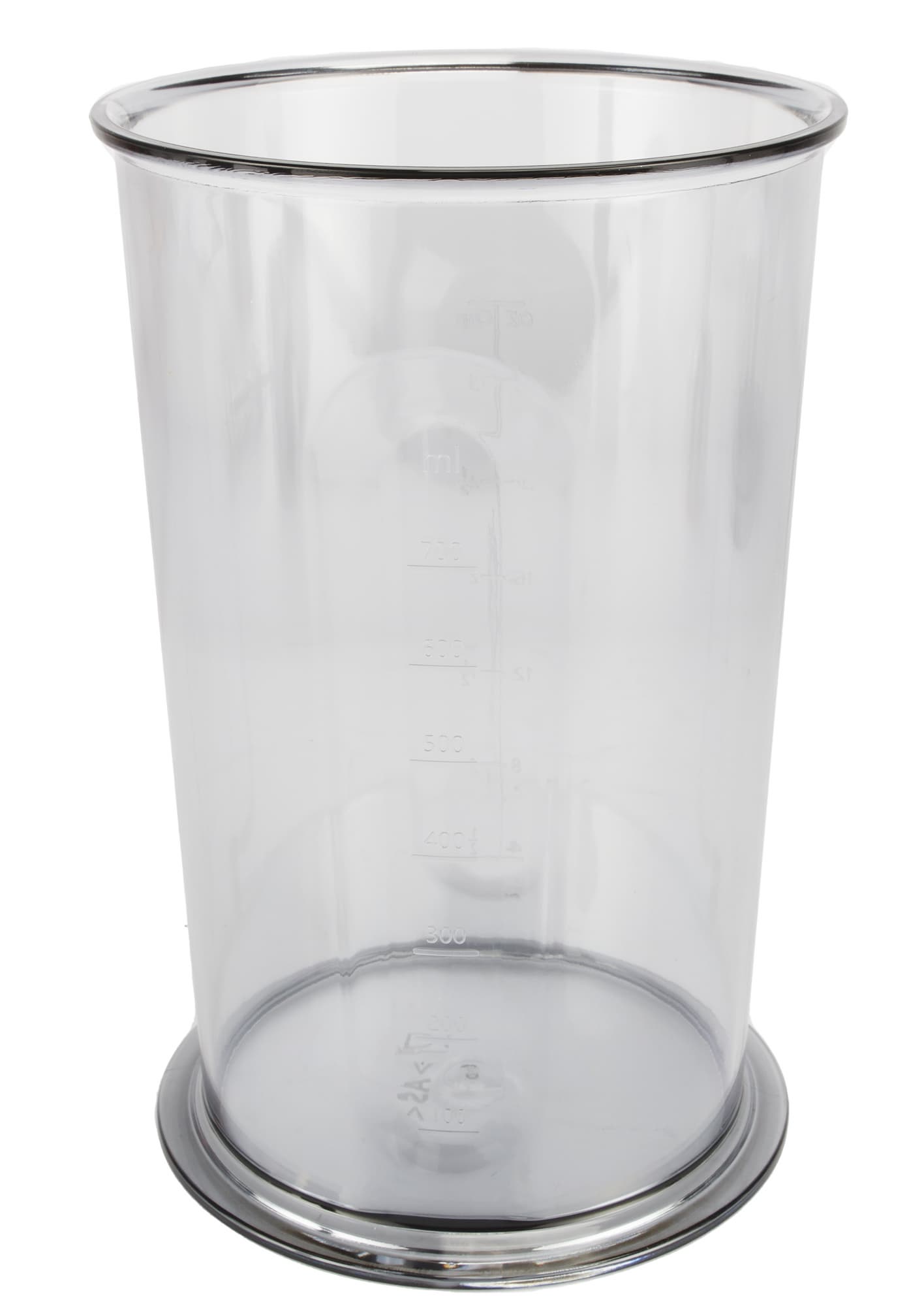 Для смешивания ингредиентов предусмотрен стакан из прочного прозрачного пластика с рабочим объемом 700 мл. Носика и крышки у стакана нет. Из полезного — расширенное основание для надежной устойчивости, а также нанесенная объемная градуировка в миллилитрах с одной стороны и в унциях с другой — на случай если пользователь станет готовить по какому-нибудь англоязычному рецепту.