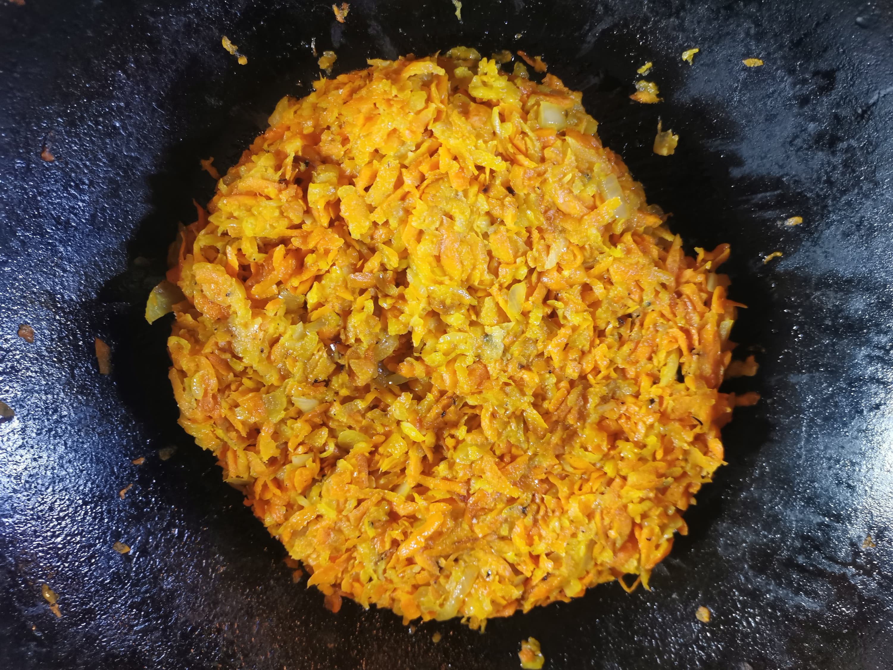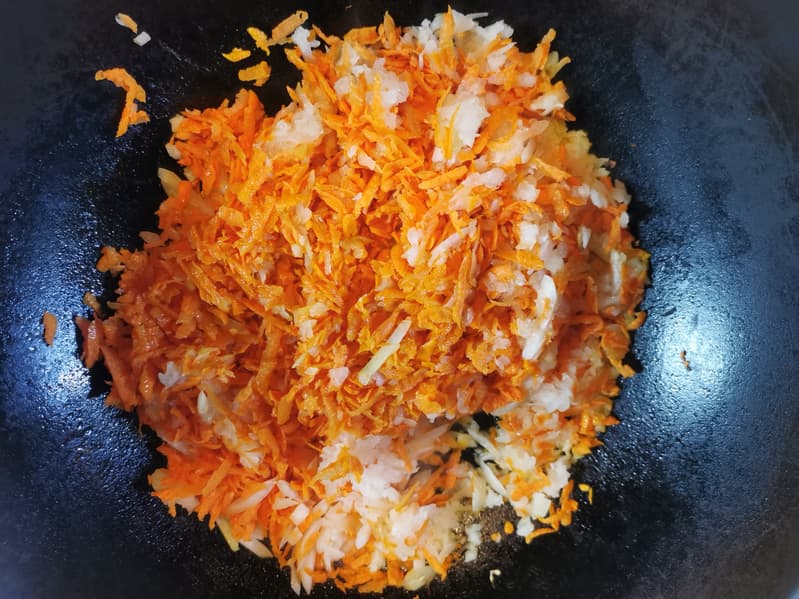 Печень мы хорошенько промыли холодной водой и отправили вариться. Тем временем натерли лук и морковь и сделали из них ароматную зажарку.