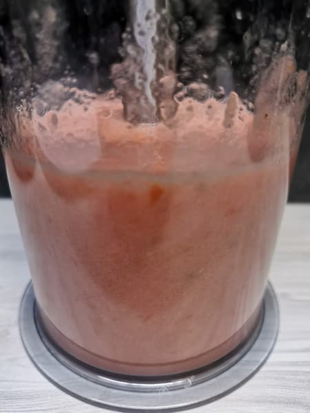 За 30 секунд на максимальной скорости у нас уже получилась измельченная томатная смесь, но крупные кусочки шкурок всё еще виднелись.