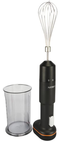 Особенностью данной модели, помимо отсутствия провода, является количество насадок, одна из которых даже является редкостью среди блендеров. Всего у HB1 их четыре: стандартная погружная для смешивания, насадка с S-образным ножом и чашей для измельчения продуктов, насадка-венчик для взбивания жидких продуктов и насадка-капучинатор для вспенивания молока. Все прочие характеристики плюс-минус стандартны для погружного блендера, поэтому нам остается только оценить его внешний облик и проверить удобство эксплуатации. Приступаем.