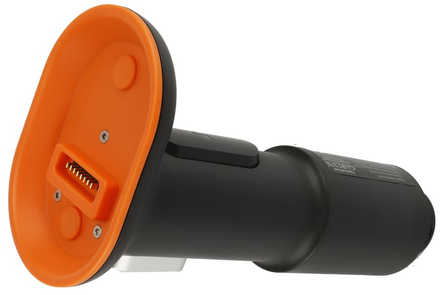 Гнездо для установки аккумулятора находится у верхушке моторного блока. Оно сделано из яркого оранжевого пластика.