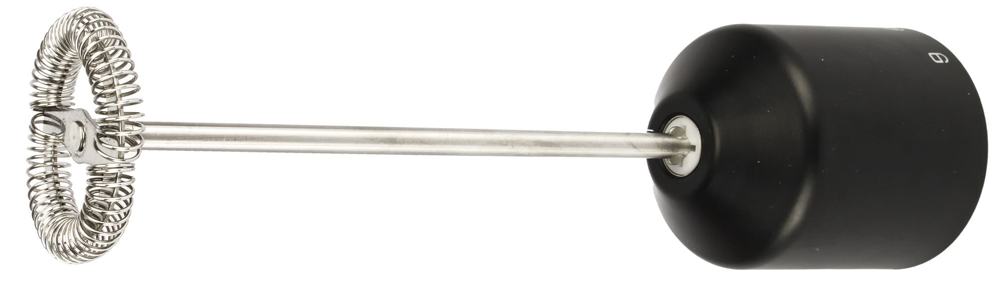 Вспениватель для молока устанавливается в тот же пластиковый переходник, что и венчик. Эта насадка представляет собой длинный штырь с кольцом, вокруг которого закреплены две пружины. Она имеет скромные размеры и сделана из нержавеющей стали.