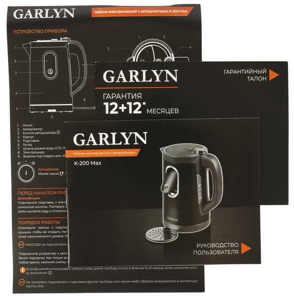 Garlyn K-200 Max оказался не совсем удобен при выливании воды: небольшое количество жидкости задерживалась внутри колбы и не хотело покидать чайник. Также струя воды из чайника получалась неидеальной — из общей массы иногда летели брызги. Несъемная крышка, открывающаяся лишь наполовину, не дала нам возможности детально изучить чайник внутри, а кому-то не позволит помыть его вручную. Мелкими несовершенствами для нас оказались мерцающая подсветка мерной шкалы и небольшой объем чайника.