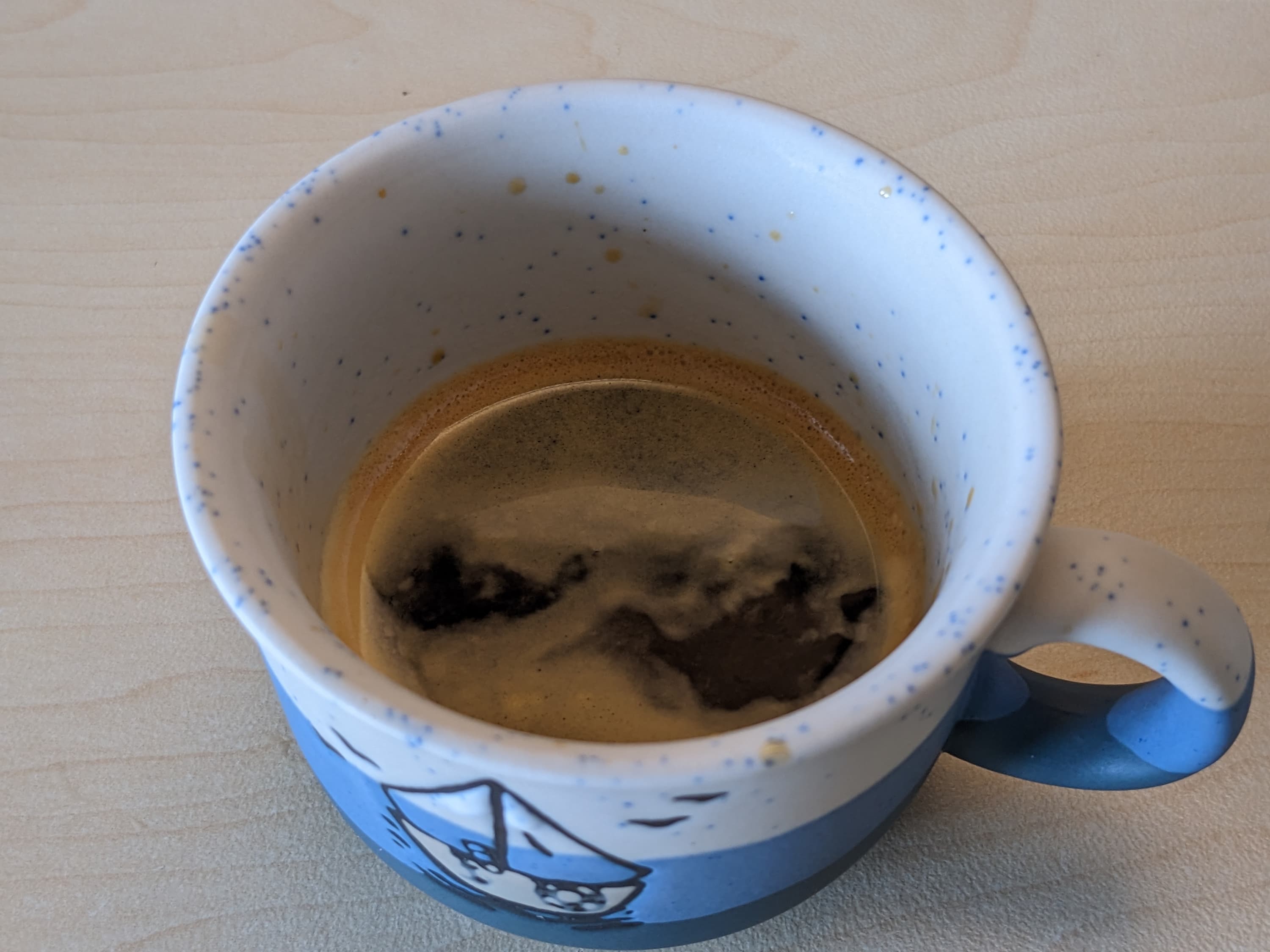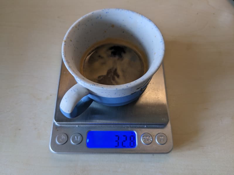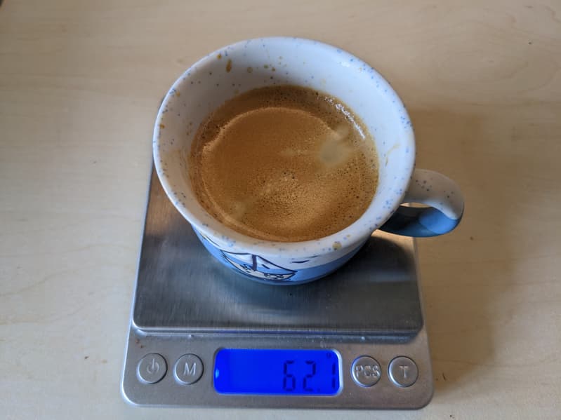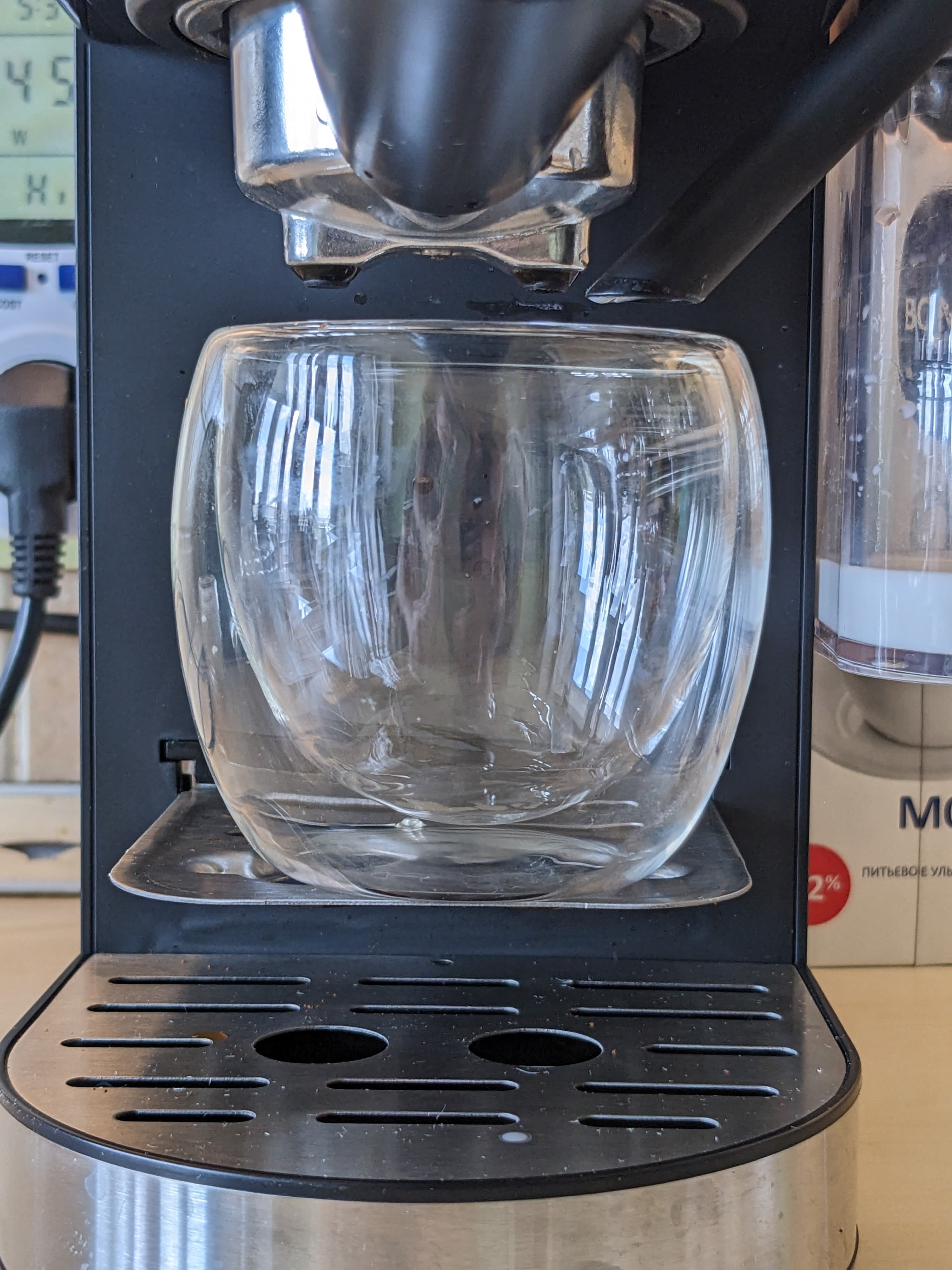 Одинарный эспрессо на стандартных настройках у нас получился весом 32,8 г, температура в непрогретой чашке — 69 °C. Неплохо.