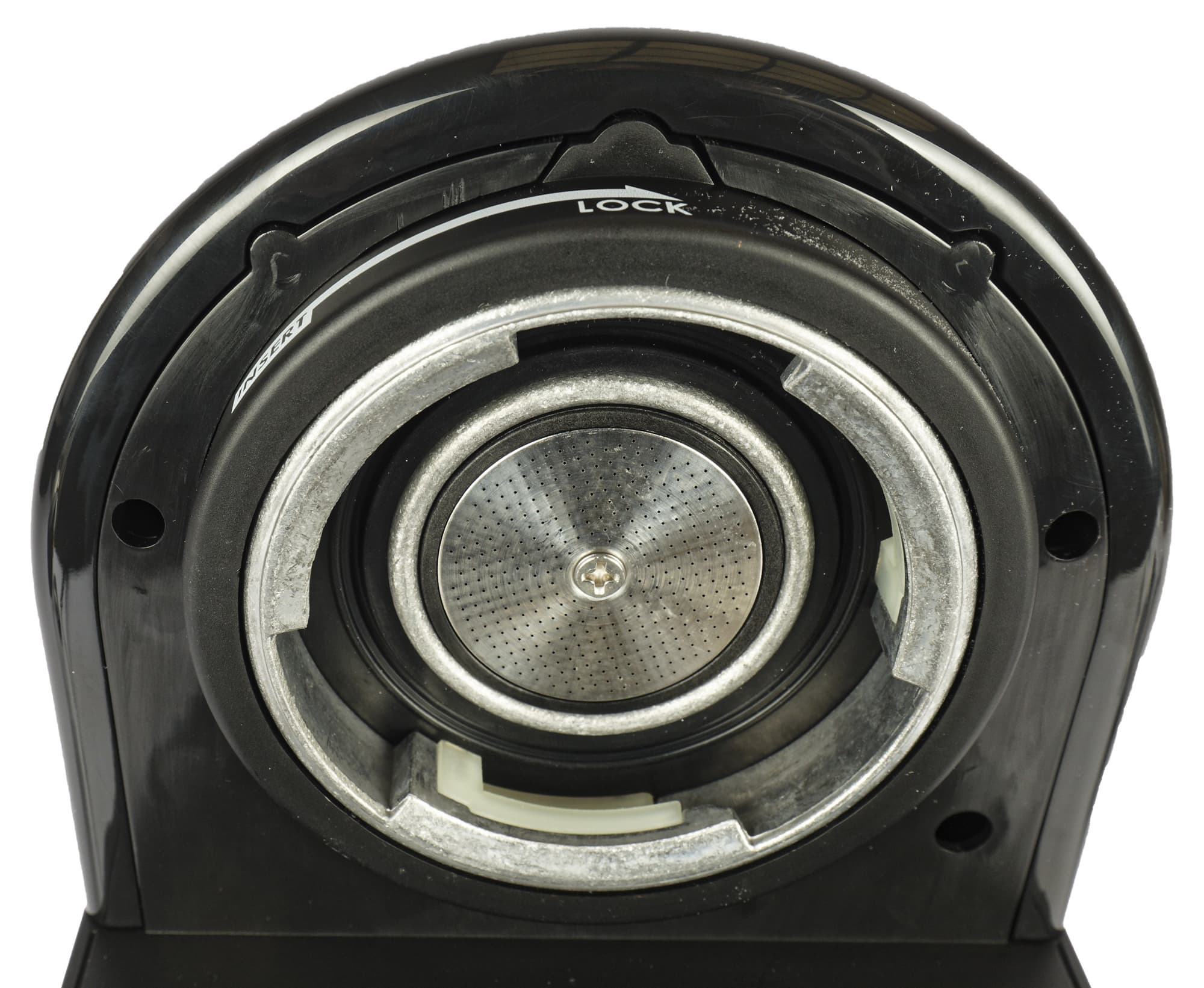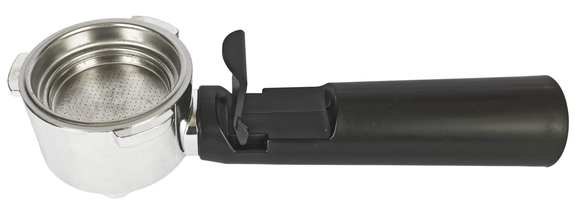 Рожок диаметром 51 мм также выполнен из алюминия. Его конструкция — самая что ни на есть традиционная. На пластиковой ручке стоит фиксатор, удерживающий фильтр; пластиковая вкладка снабжена «улучшайзером», а на дне — два отверстия, позволяющие разливать кофе сразу в две чашки.