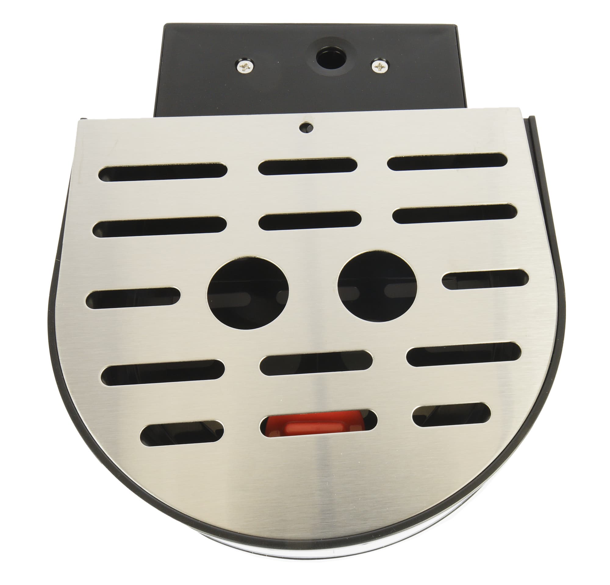 Съемный поддон для капель пластиковый, с металлической верхней панелью. Над ним расположена несъемная откидная полочка из нержавеющей стали — для небольших чашек.