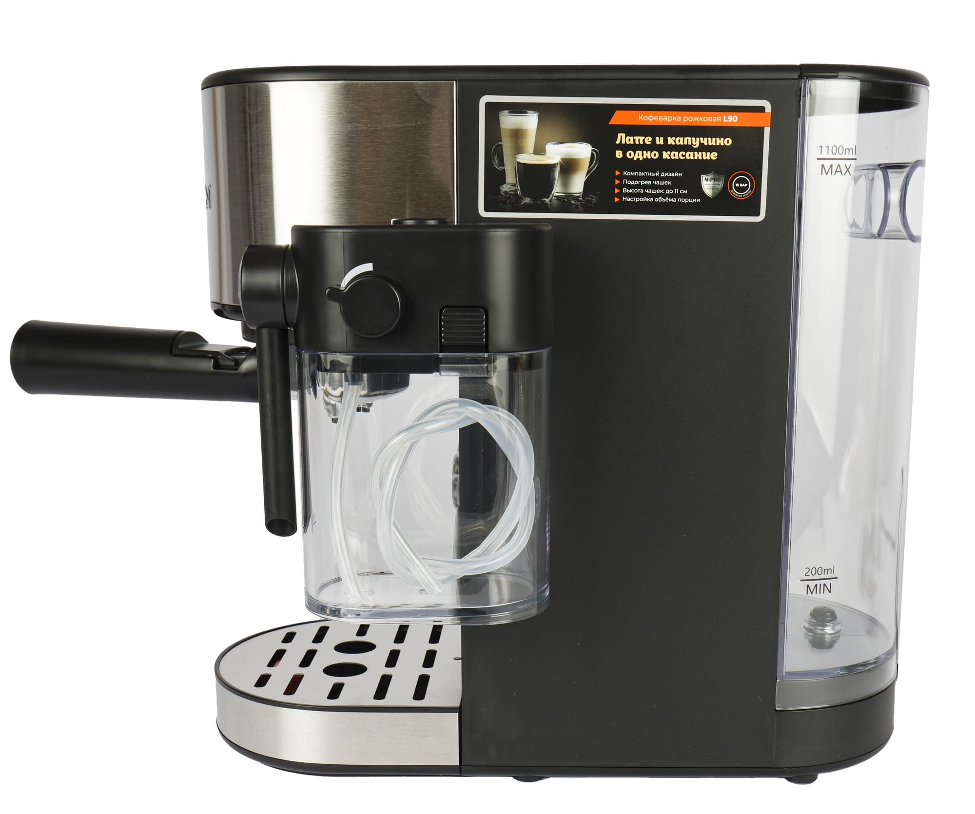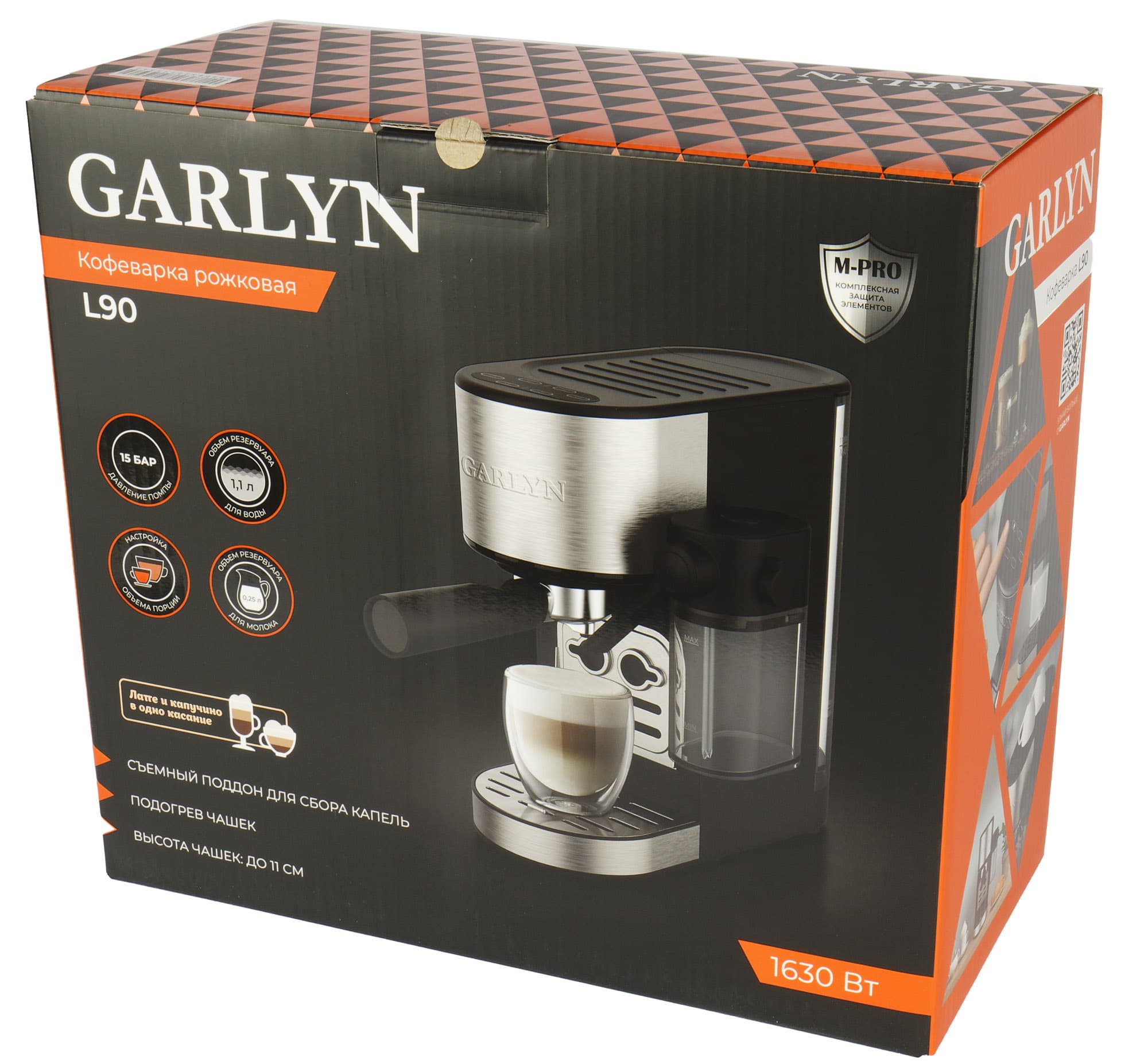 У кофеварки Garlyn L90 узкий корпус, подходящий для малогабаритных кухонь: ее ширина с установленным молочным резервуаром всего 19 сантиметров.