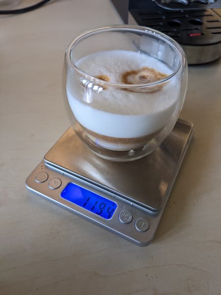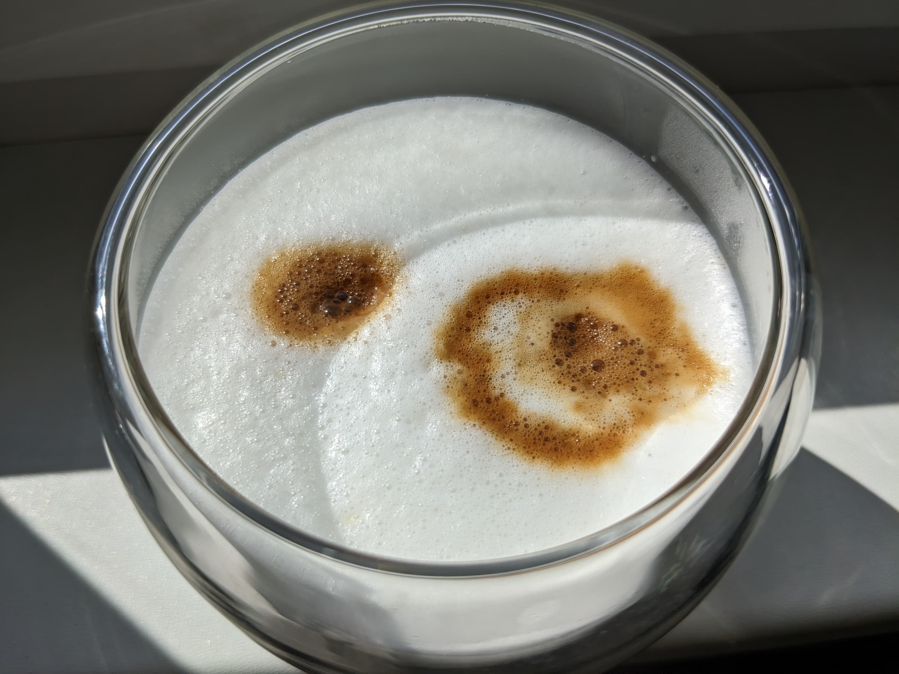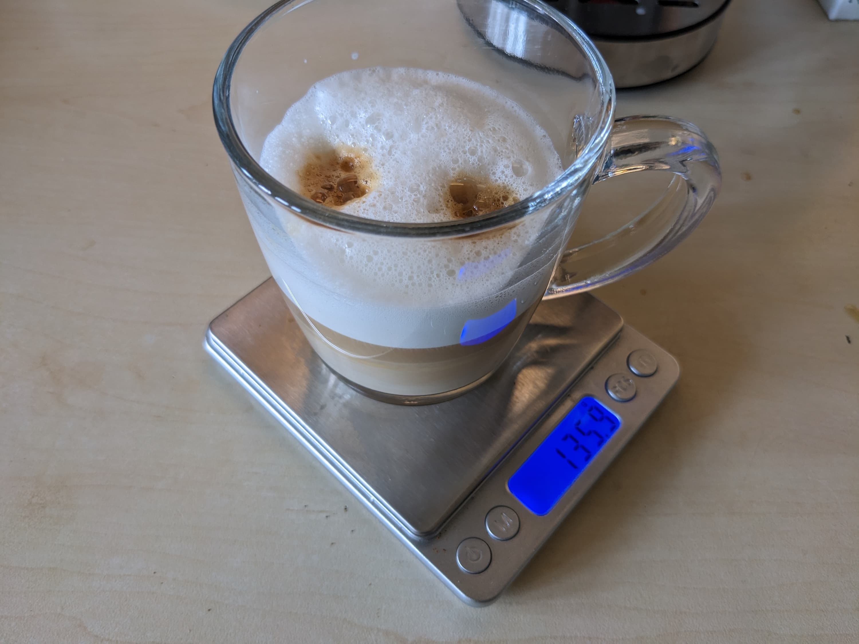 На этом и последующих тестах мы использовали интенсивность вспенивания чуть меньше максимальной. Получившаяся пенка выходит стойкой, сладковатой (что говорит о правильно настроенной температуре), хотя и не слишком однородной: для полного соответствия идеалу в ней многовато крупных пузырьков.