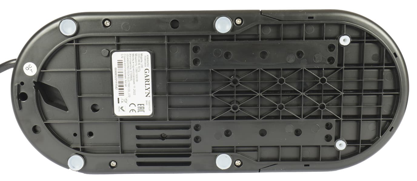 На дне кофеварки мы видим резиновые ножки-присоски, надежно удерживающие устройство на гладкой поверхности. Здесь же — традиционный шильдик с краткой информацией о приборе и серийным номером.