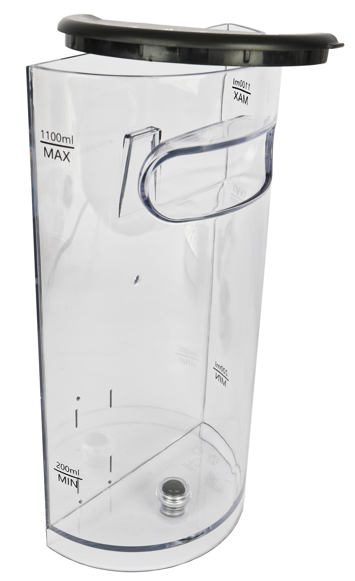 Крышка емкости полностью снимается. Для удобства переноски у бака есть пластиковая ручка. На обеих сторонах нанесены отметки максимального (1100 мл) и минимального (200 мл) уровней. Пружинный клапан не выступает из дна: это обеспечивает использование всего объема жидкости без остатка.