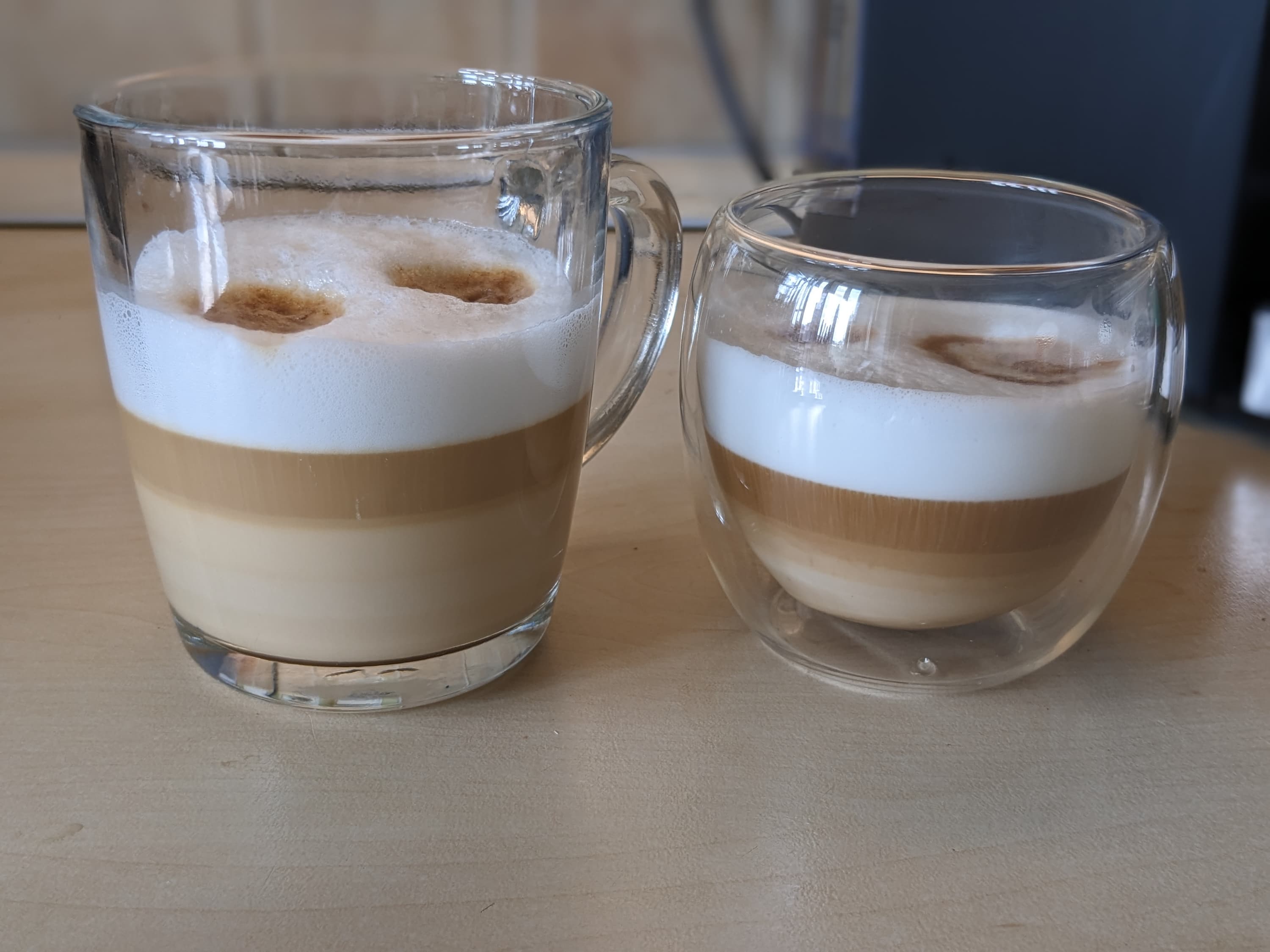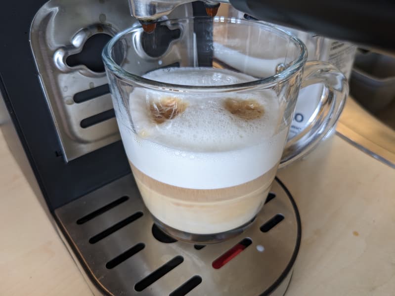 На соответствующей программе кофеварка наливает сначала молочную пенку, а затем добавляет эспрессо из рожка.