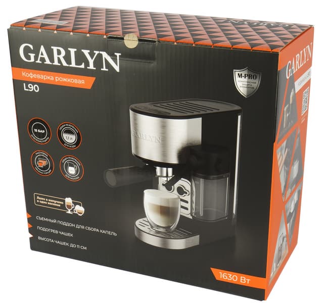 Картонная коробка, в которой к нам приехала кофеварка, оформлена в фирменном стиле Garlyn: контрастное оранжево-черное цветовое оформление и узор из треугольников на верхней стороне. В треугольных же картушах на боках напечатаны фотографии устройства в действии.
