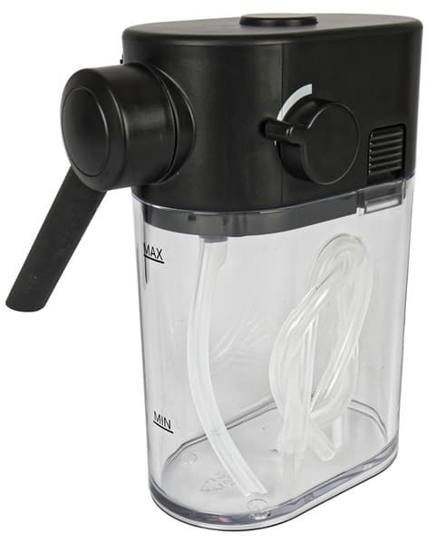 На прозрачную стенку нанесены отметки максимального и минимального уровня. Риска «Min» примерно соответствует одной порции капучино или латте. За регулировку интенсивности вспенивания отвечает плавно вращающийся регулятор. При желании можно не наливать молоко в емкость, а подавать его прямо из упаковки. Для этого устройство комплектуется дополнительной удлиненной силиконовой трубкой.