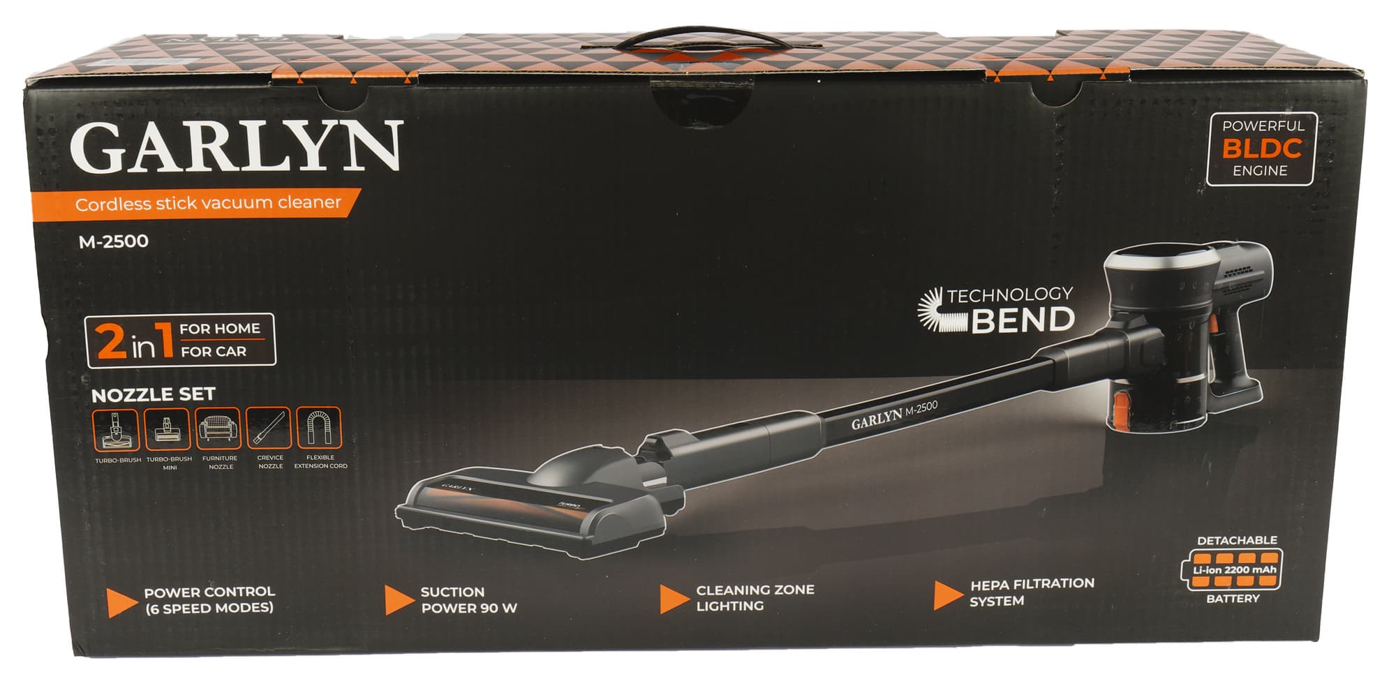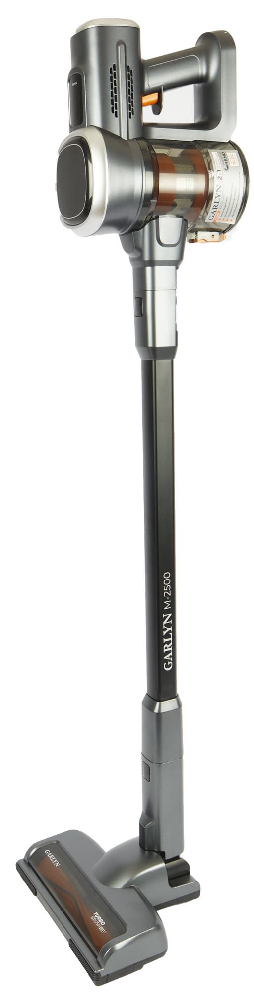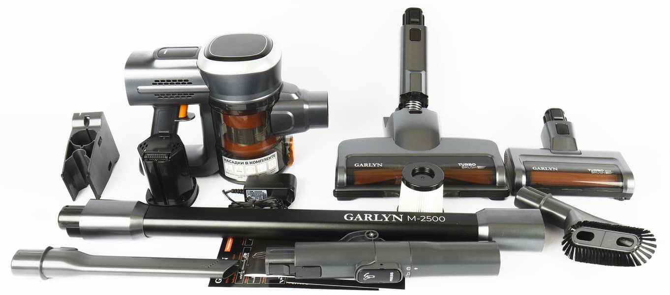 Хотя M-2500 — младший представитель линейки беспроводных пылесосов от Garlyn, по комплектации этого не скажешь: в комплект входят целых две электронасадки, а в дополнение к стандартной удлинительной трубке производитель добавил еще одну — шарнирную, для ручной уборки.