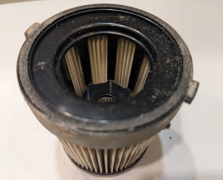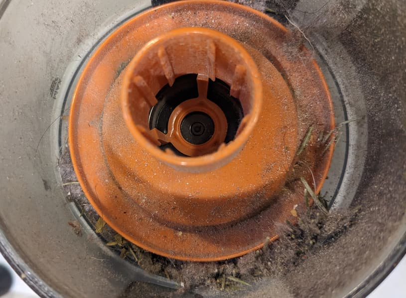 Мелкая сетка циклона хорошо отделяет даже мелкий мусор, но не пыль. Она долетает до HEPA-элемента и оседает на его гармошке: предварительного фильтра тут нет.
