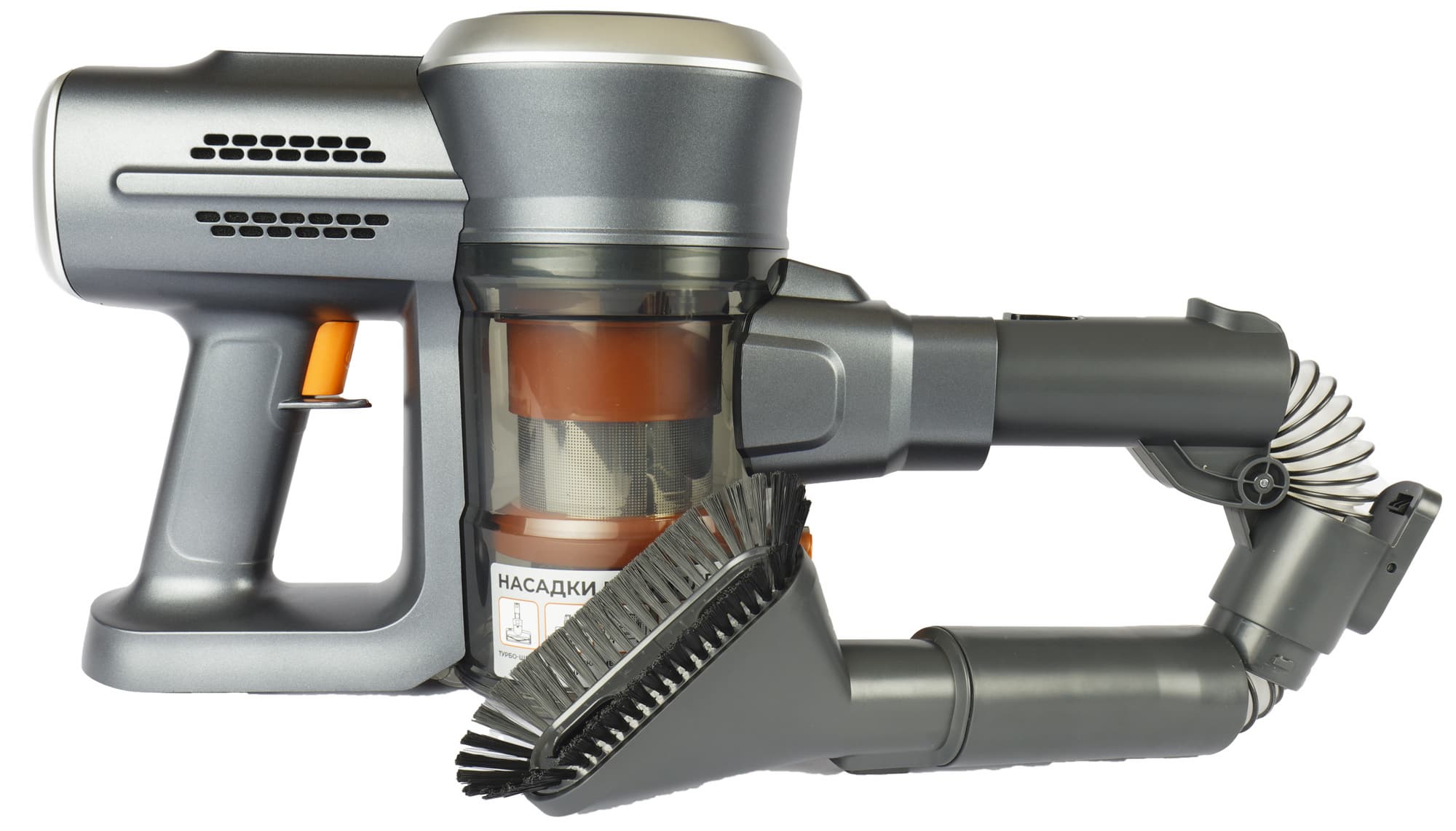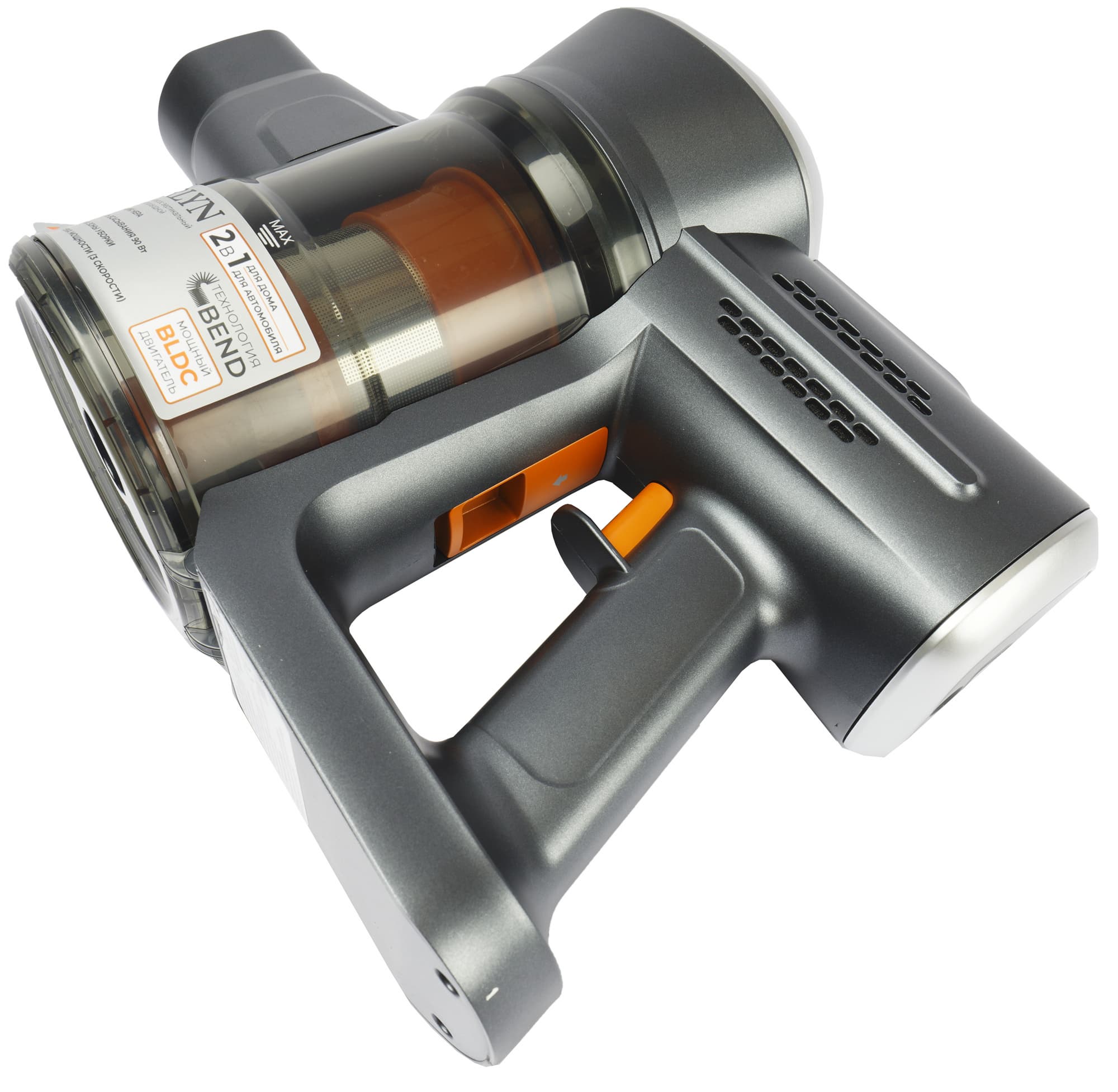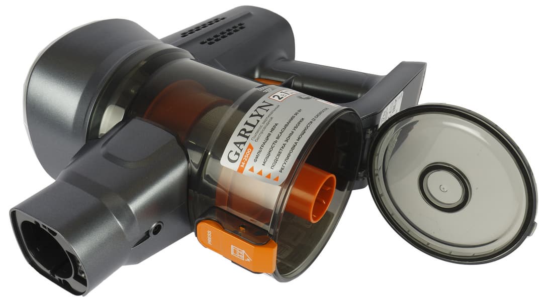 Немногие производители в наше время придерживаются единого фирменного оформления в линейках бытовой техники. Приятно видеть, что Garlyn среди них. Все подвижные детали — защелки, клавиши, кнопки и циклонный фильтр — сделаны из ярко-оранжевого пластика, который напоминает об узнаваемом стиле компании.